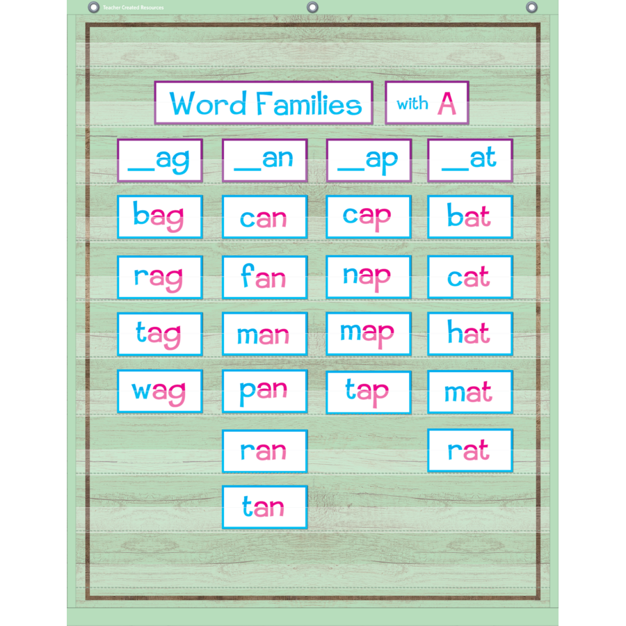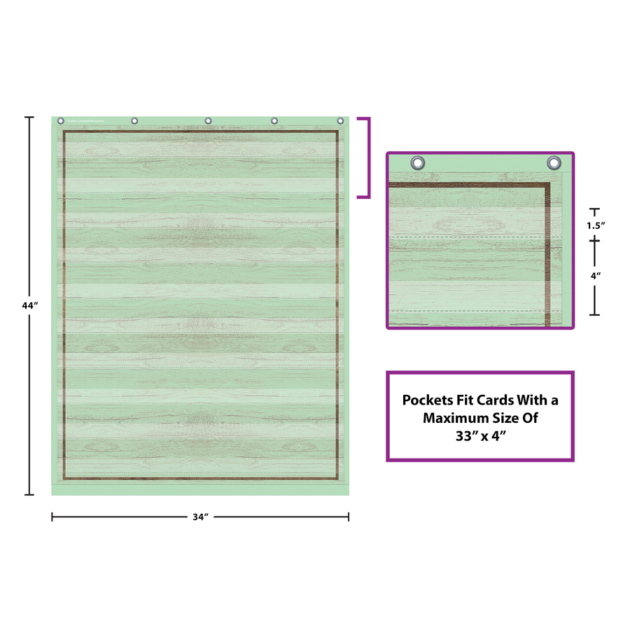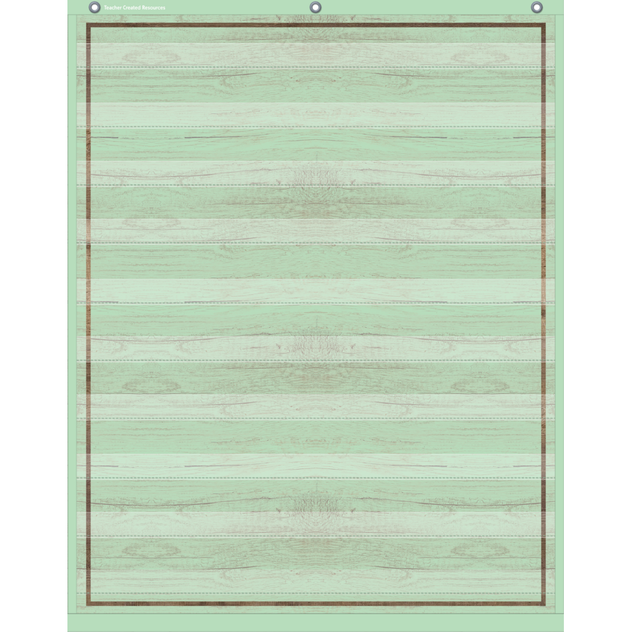 This lightweight and durable Mint Painted Wood pocket chart features colorful designs and hangs easily from sturdy, metal grommets. The non-porous surface is easy to clean and can be wiped-down or sprayed with disinfectant to help prevent the spread of germs. Measures 34" x 44".