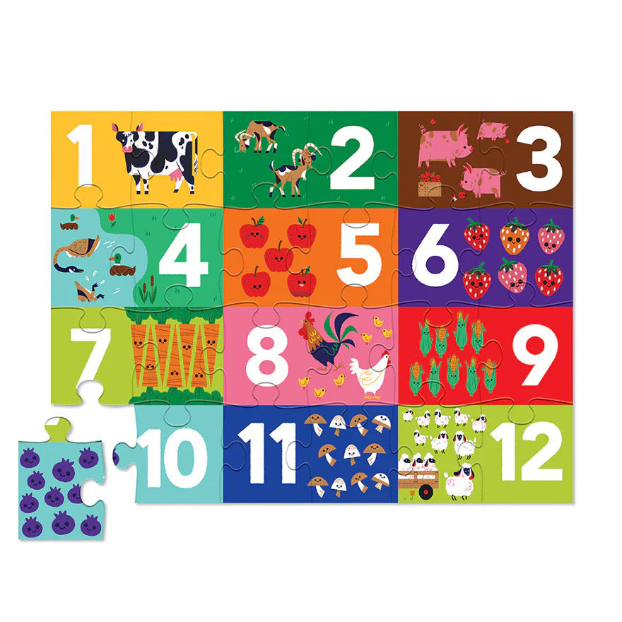 From 1 cow gazing to 12 sheep grazing each animal is beautifully illustrated with vibrant colors that will capture the imagination of young learners. As your child pieces together the puzzle, they will explore the different farm icons of the alphabet and develop their cognitive skills along the way.