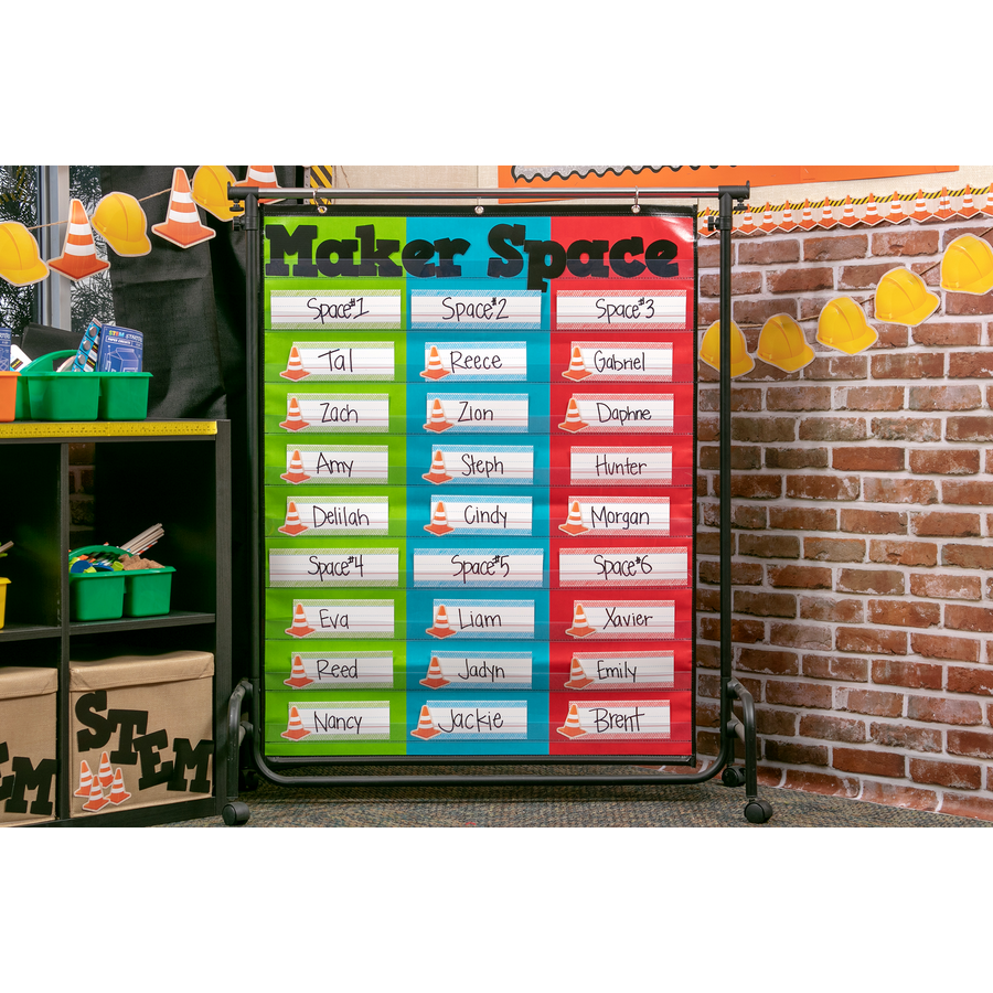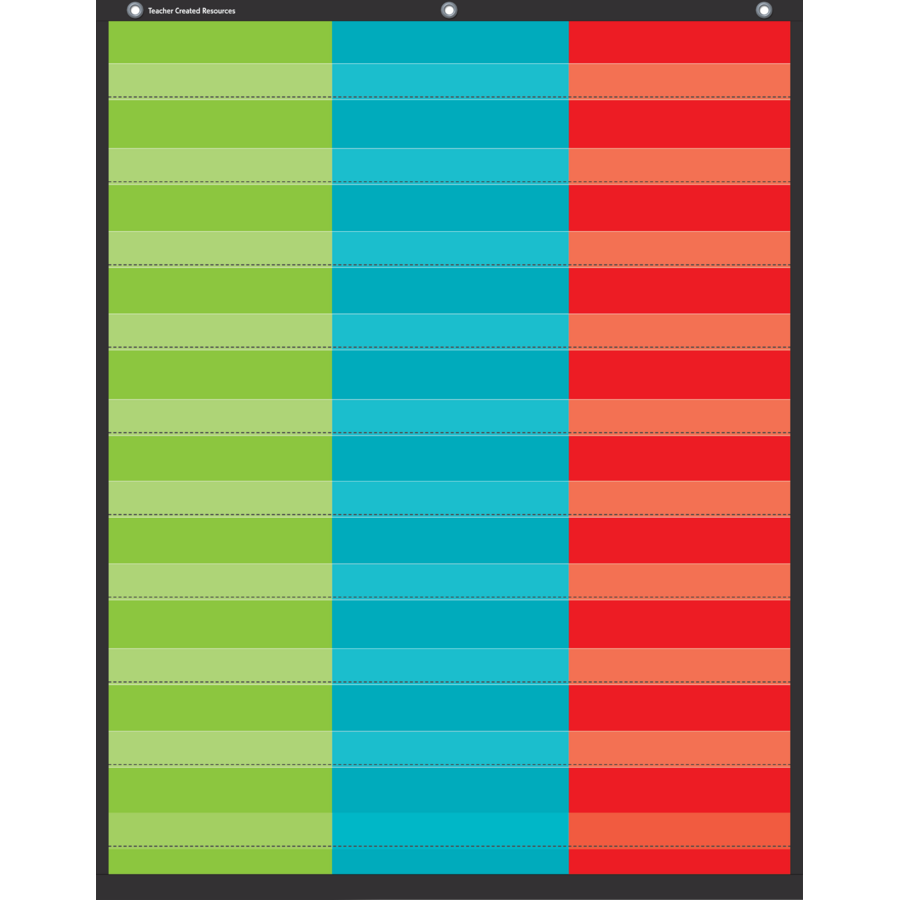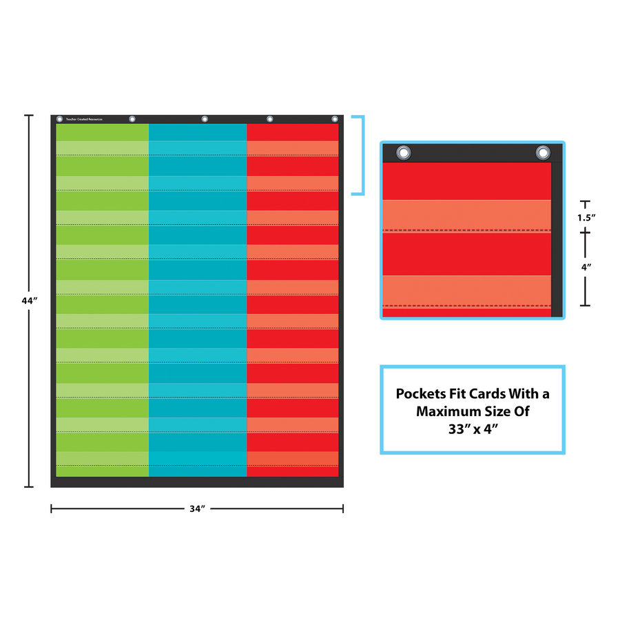 This lightweight and durable 3 Column pocket chart features a colorful design and hangs easily from sturdy, metal grommets. Use it as a classroom behavior chart or for organizing and categorizing classroom information. Perfect for KWL activities, word walls, identifying word parts, showing cause and effect, and more! The non-porous surface is easy to clean and can be wiped-down or sprayed with disinfectant to help prevent the spread of germs. Measures 34" x 44".