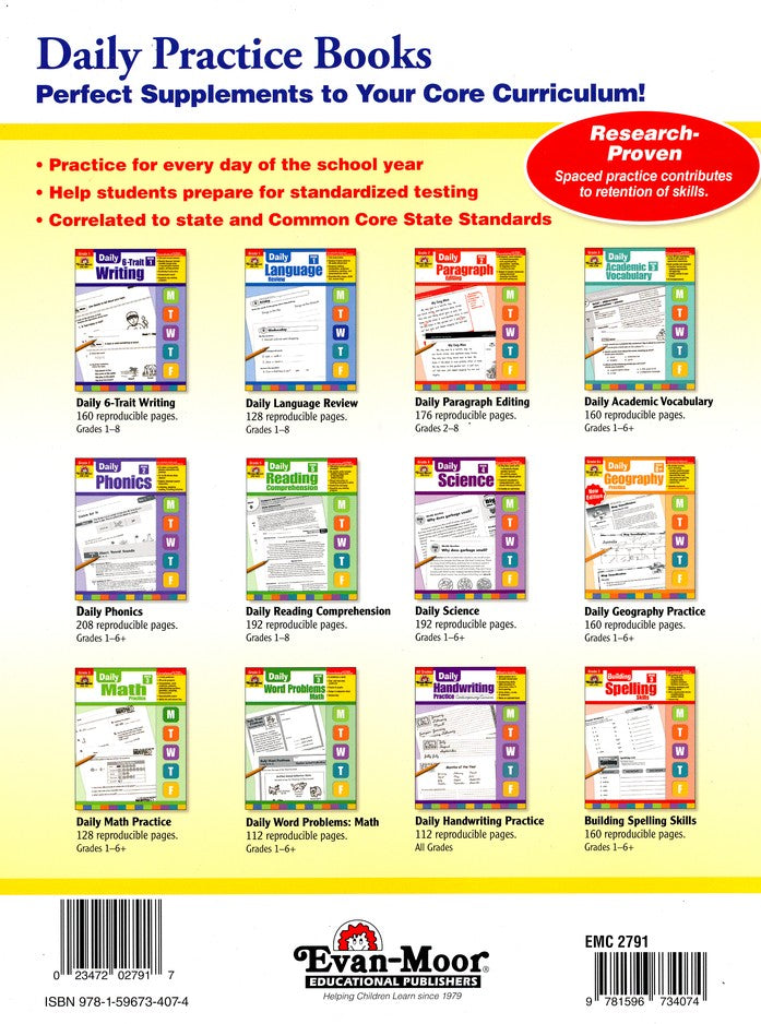 Keep language skills sharp with focused practice! With Evan-Moor's Daily Language Review, students practice language skills covering punctuation, verb tense, conjunctions, word meaning, and more in ten- to fifteen-minute daily lessons; five questions are provided for every day of a 36-week school year.