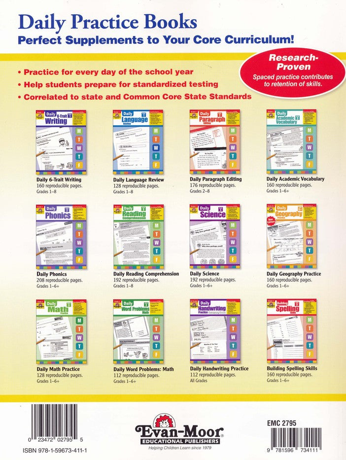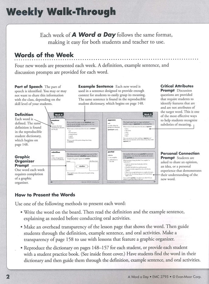 Build up stores of vocabulary with just one word a day! Each week, four new words are presented with a definition, sample sentence, and discussion prompts (one per day). The fifth day is used for an end-of week review that reviews the four previously-learned words through oral & written review exercises. A reproducible student dictionary and cumulative word index are also included. 160 reproducible pages, softcover. Grade 5.