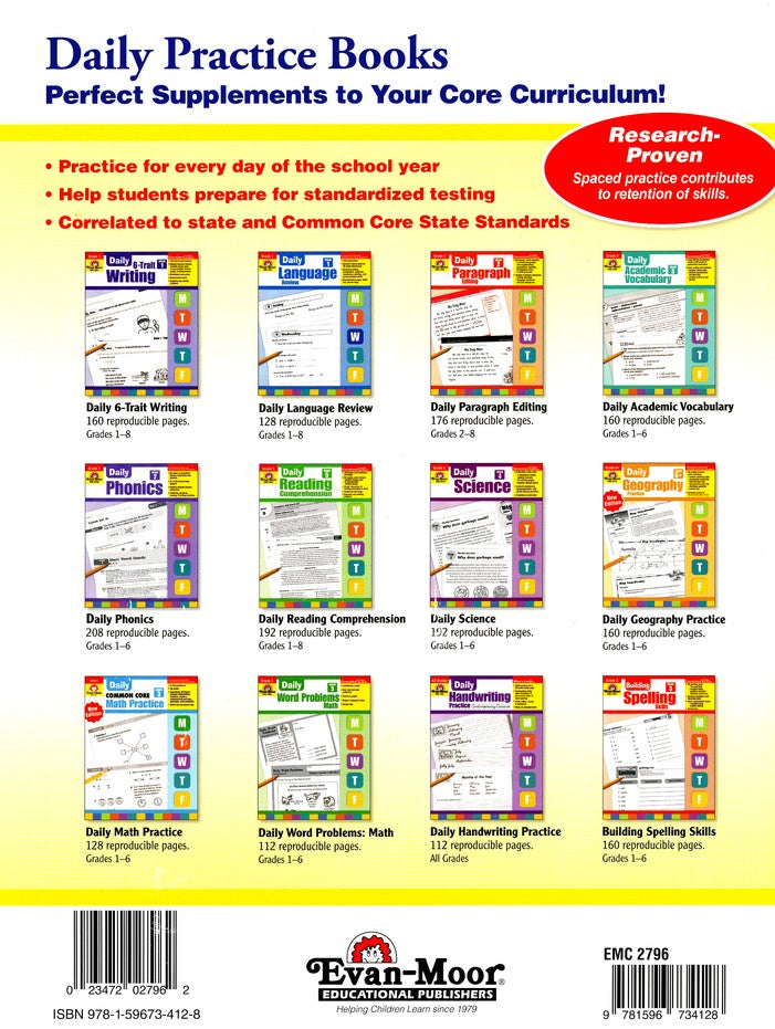 Build up stores of vocabulary with just one word a day! Each week, four new words are presented with a definition, sample sentence, and discussion prompts (one per day). The fifth day is used for an end-of week review that reviews the four previously-learned words through oral & written review exercises. A reproducible student dictionary and cumulative word index are also included. 160 reproducible pages, softcover. Grade 6.