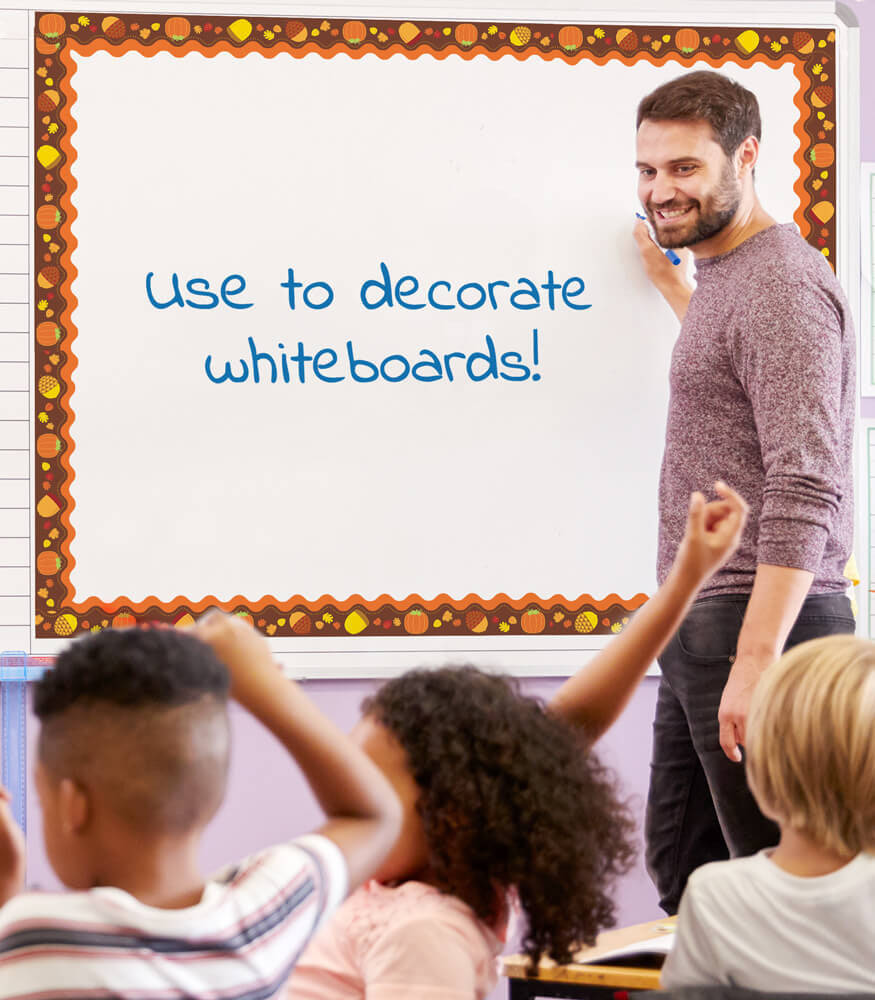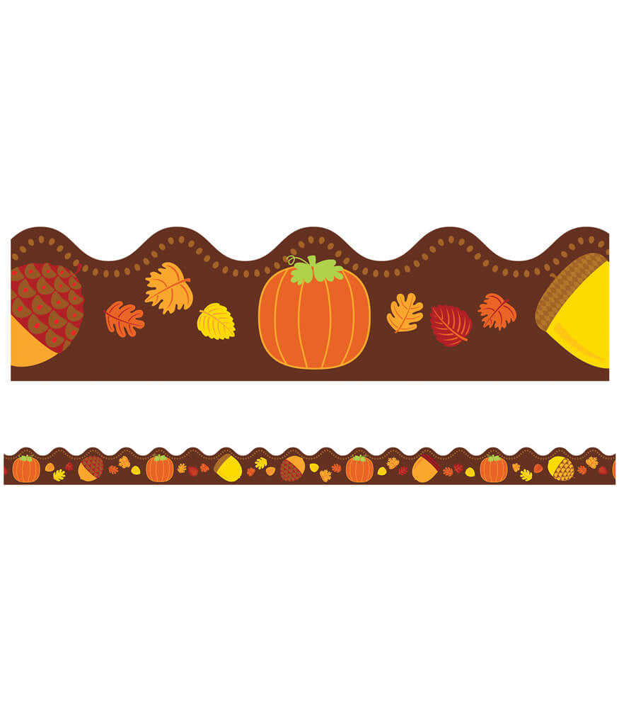 Accent curriculum displays or highlight classroom decor with affordable and versatile borders. The Acorns & Pumpkins scalloped border provides an easy, time-saving way to add style to your learning environment. Cut and layer this festive scalloped border to accent windows, doors, or bulletin boards with style that matches the season.