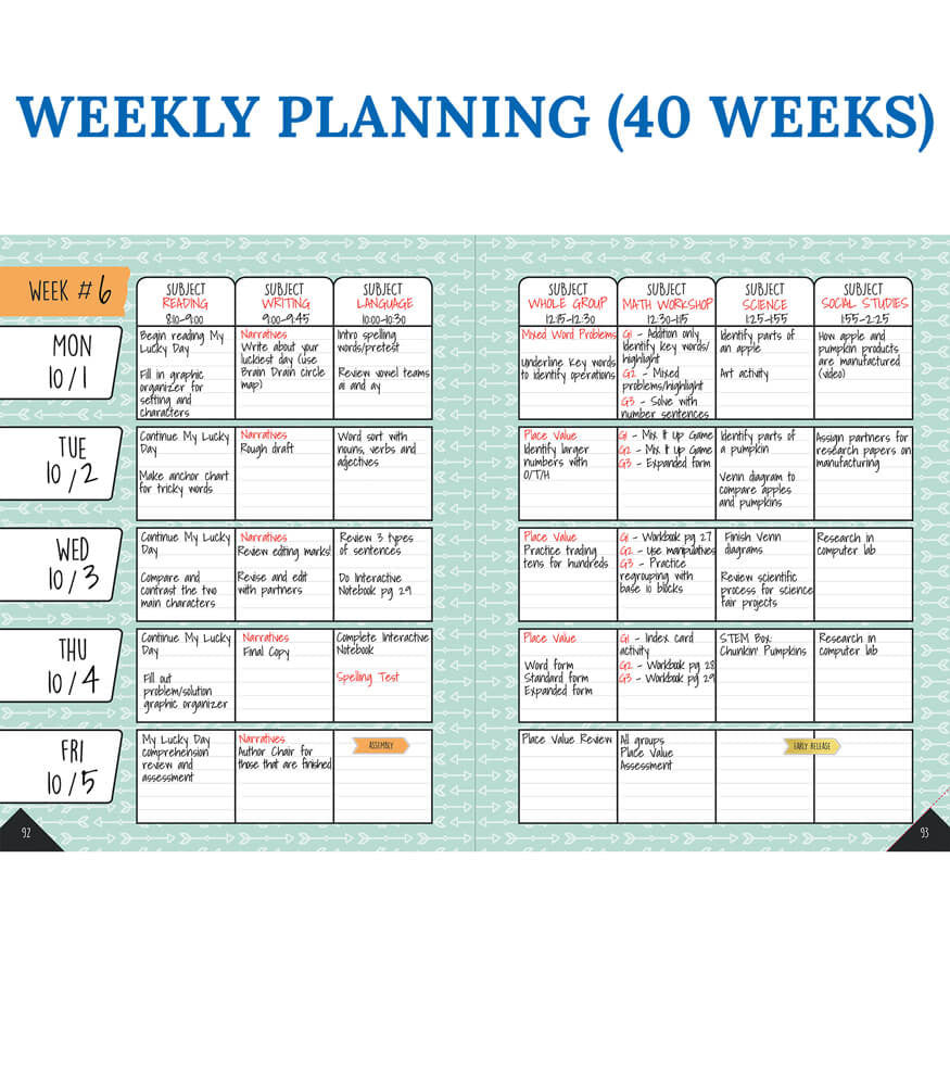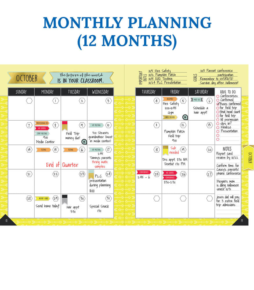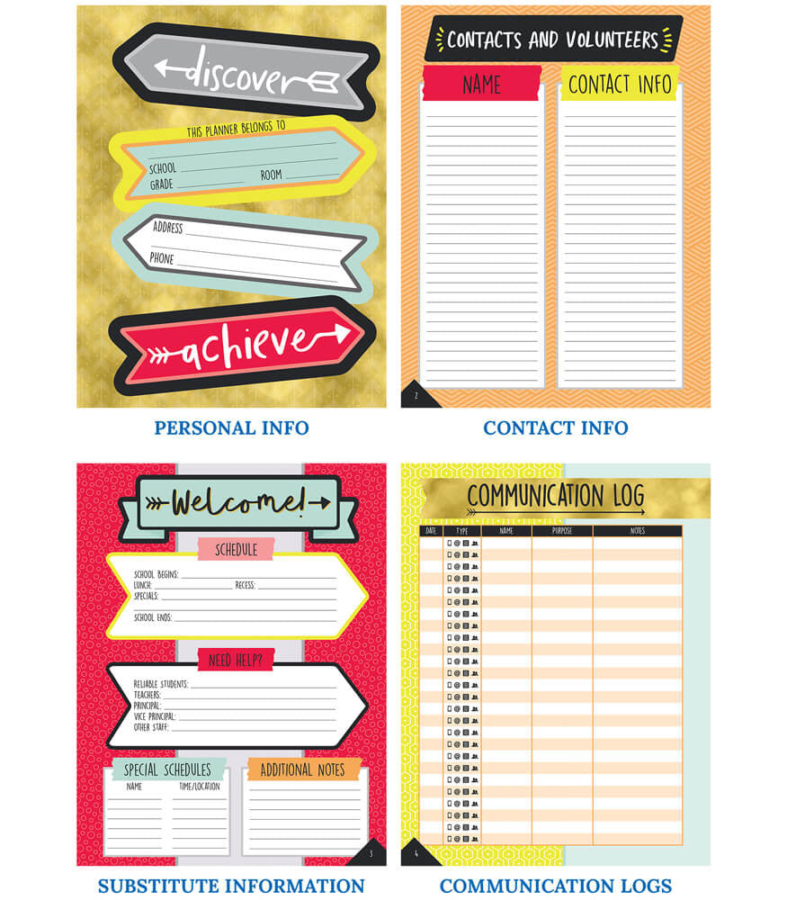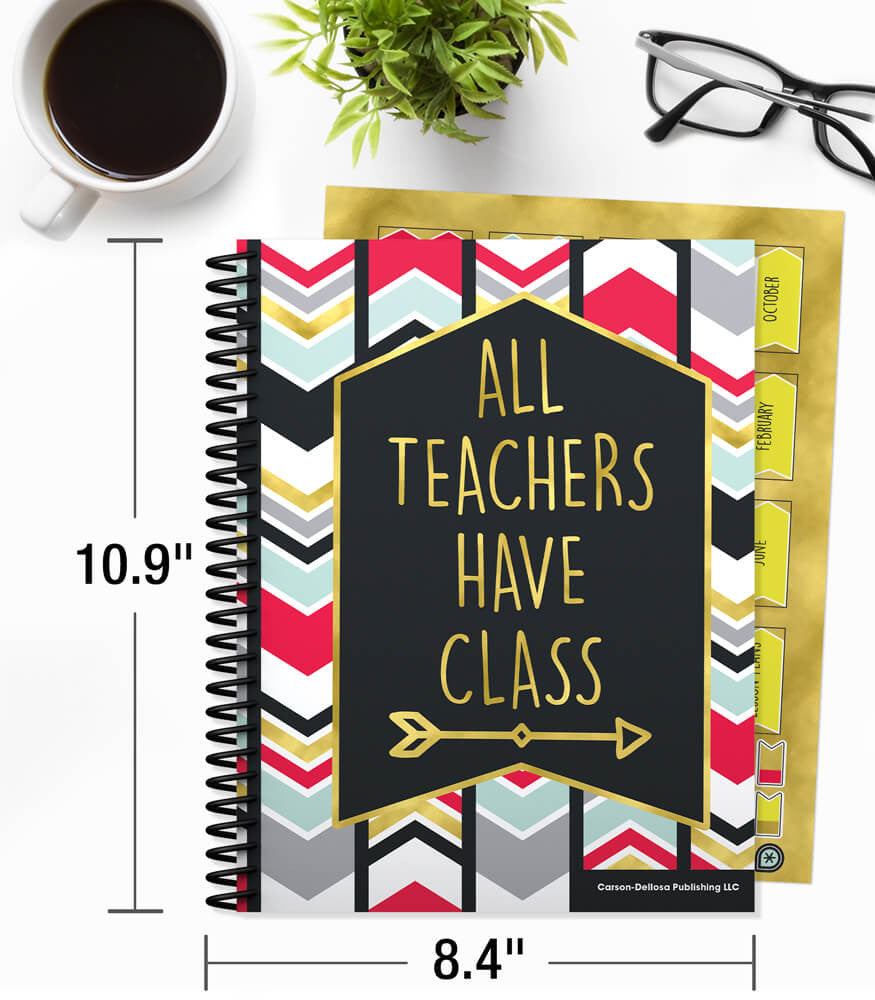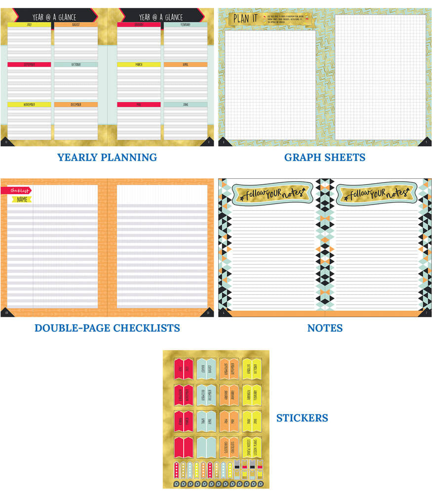 Description: This colorful teacher planner provides a simple and stylish solution for staying on schedule. The 128-page Aim High Teacher Planner helps teachers organize information and lesson plans for the school year. This planner measures 8.375" x 10.875" and provides spaces for these areas: substitute information, yearly planning, monthly planning (July to June), weekly planning (40 weeks), contact info, communication logs, double-page checklists, and graph sheets. This planner includes: 16 tab stickers (folds to 1.7" x.75"), 9 to-do list stickers (1.32" x.35"), and 21 accent stickers (smallest.38" x.38", largest.4" x.7"). Organize your school year in style with the comprehensive, wire-bound Aim High Teacher Planner. This plan book features durable spiral binding for convenience and provides a place to record important information for quick and easy access. The monthly planning spreads allow you to plan goals and information for the month in one central spot. Each week covers an entire spread to allow you to record detailed notes and lesson plans. Use the checklists at the back to record grades, attendance, homework completion, and more. Check out other Aim High Planner Accents to create a cohesive classroom theme.