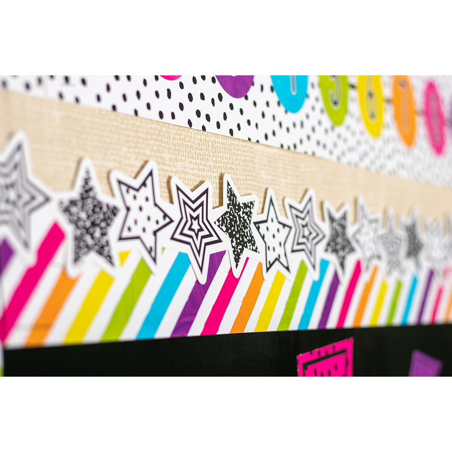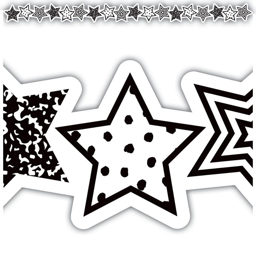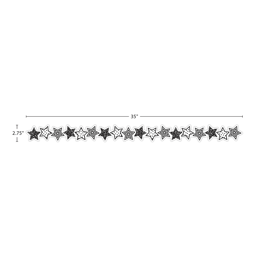 Use this Black and White Stars Die-Cut border trim to liven up your classroom! Create fresh looks for bulletin boards, windows, walls, and class projects. Mix and match with coordinating products (stickers, notepads, awards, etc.) for a classroom theme. Each pack has 12 pieces (2¾'' x 35'') for a total length of 35 feet of trim!