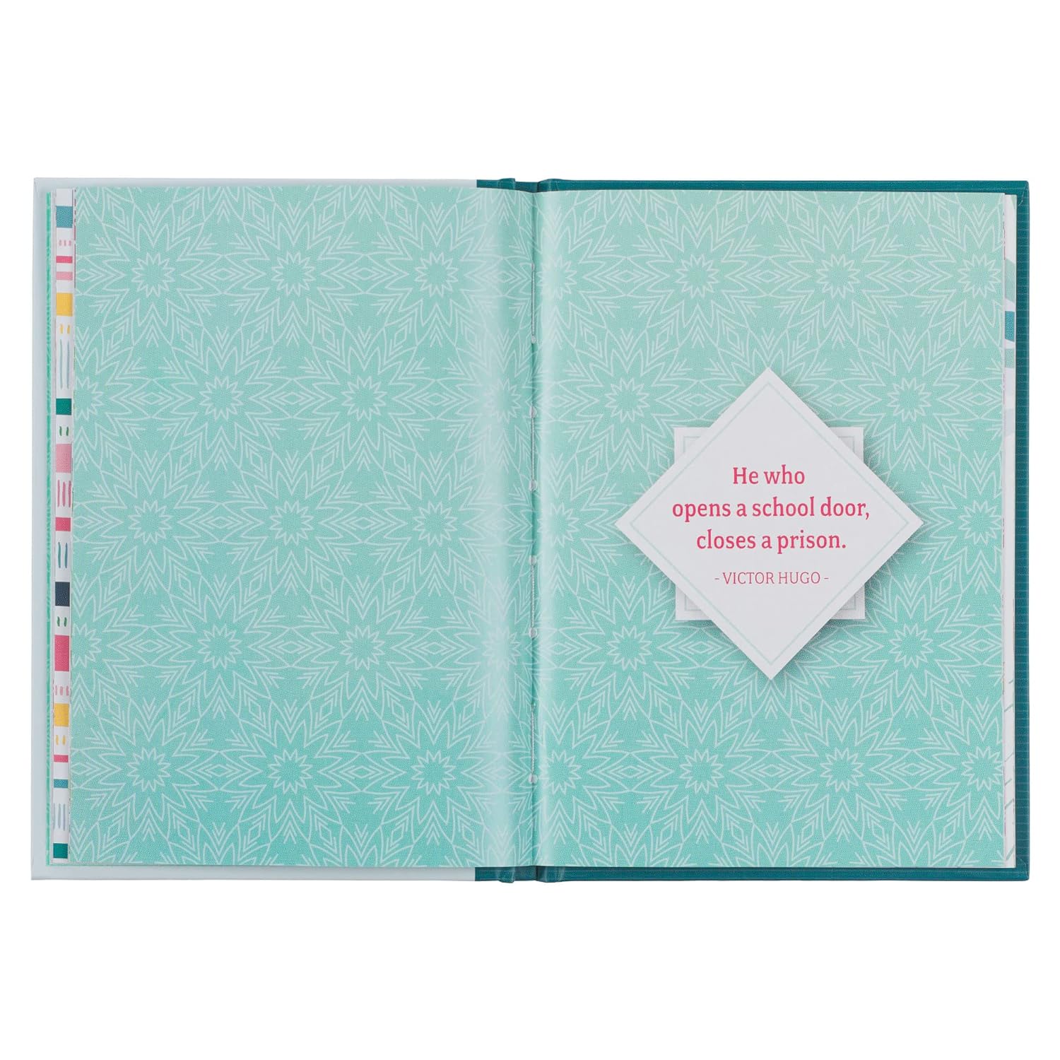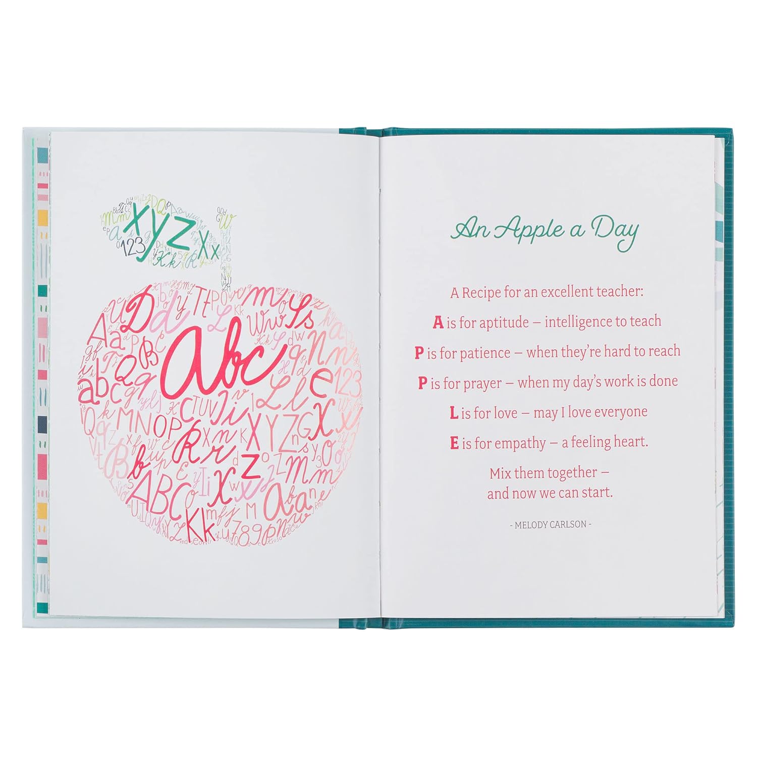 The Blessings for a Great Teacher Hardcover Gift Book is part of the Teal Best Teacher Collection, designed to celebrate the selfless work of teachers. This collection includes a ceramic coffee mug, an epoxy-filled metal keyring, a Box of Blessings®, a perpetual desktop calendar, and a gift book.
