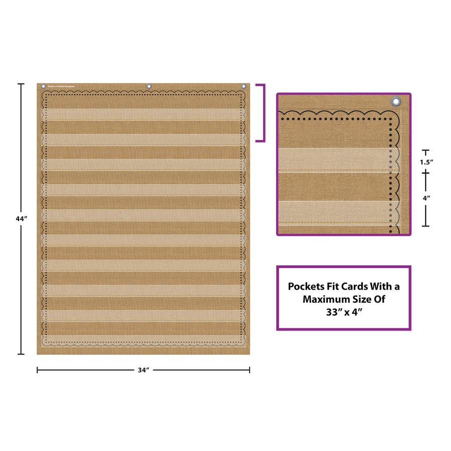 These lightweight and durable pocket charts feature colorful designs and hang easily from sturdy, metal grommets. The non-porous surface is easy to clean and can be wiped-down or sprayed with disinfectant to help prevent the spread of germs. Measures 34" x 44".