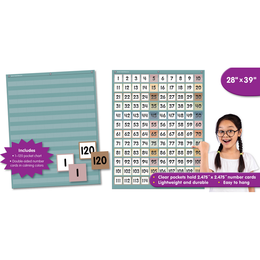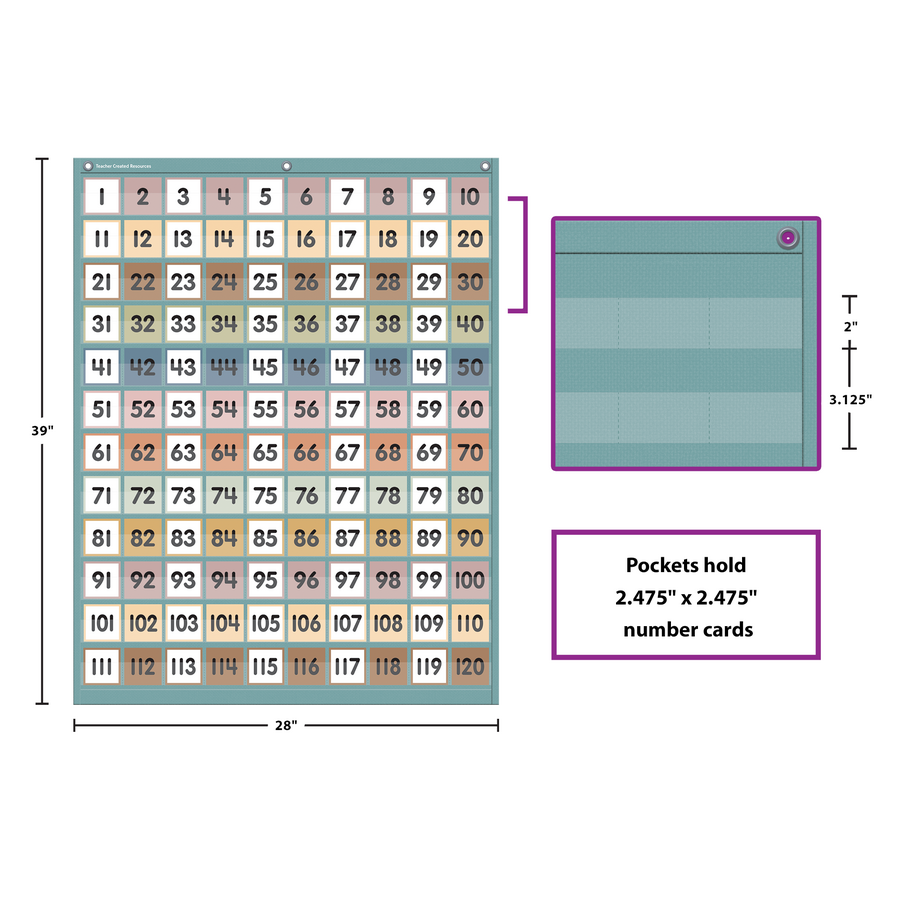 This lightweight and durable pocket chart features warm colors with multiples of 5 being highlighted in a background color and hangs easily from sturdy, metal grommets. Chart measures 28'' x 39''.