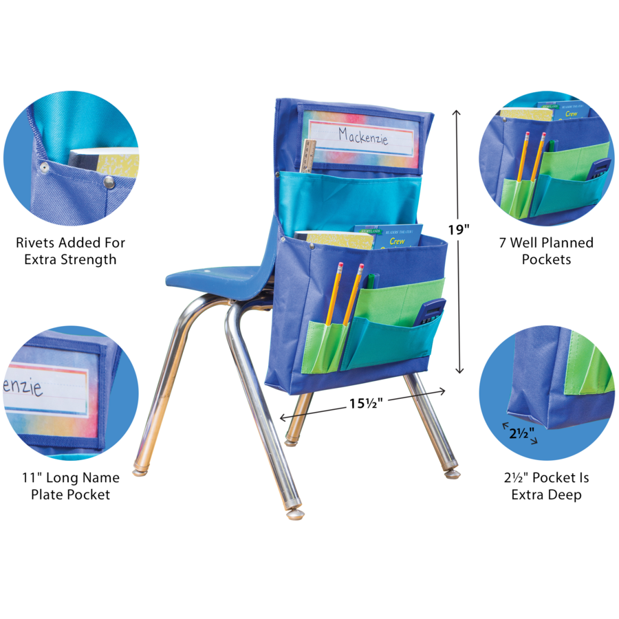 Organize supplies with this convenient storage solution Easily slides over back of chair up to 13 wide 5 from top Clear pocket holds name plate up to 3-1/2 x 11-1/2. 7 storage areas Large pockets are ideal for workbooks and folders Small pockets are ideal for supplies. Made with durable canvas. Chair pocket measures 15-1/2 x 18. Slides over back of chair up to 15 wide 5 from top Metal rivets provide extra strength at stress points.