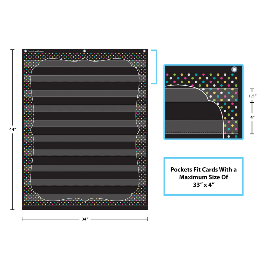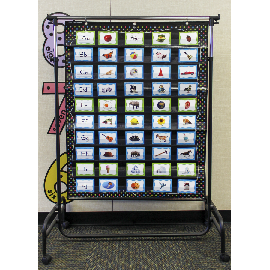These lightweight and durable pocket charts feature colorful designs and hang easily from sturdy, metal grommets. The non-porous surface is easy to clean and can be wiped-down or sprayed with disinfectant to help prevent the spread of germs. Measures 34" x 44".