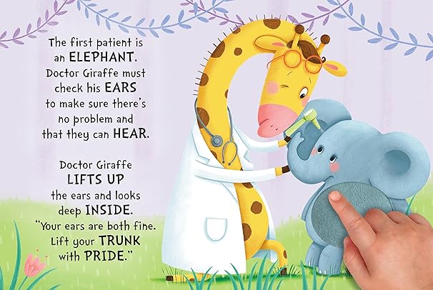 Show little ones that going to the doctor is nothing to be afraid of in the beautifully illustrated touch and feel book for toddlers. Read along as the animals all go for their checkups. The monkey gets his heart checked, the elephant gets his ears checked, the brave lion gets a shot, the snake gets his temperature taken and the iguana says "ahhh." Each spread, as well as the cover, features a different touch and feel element.