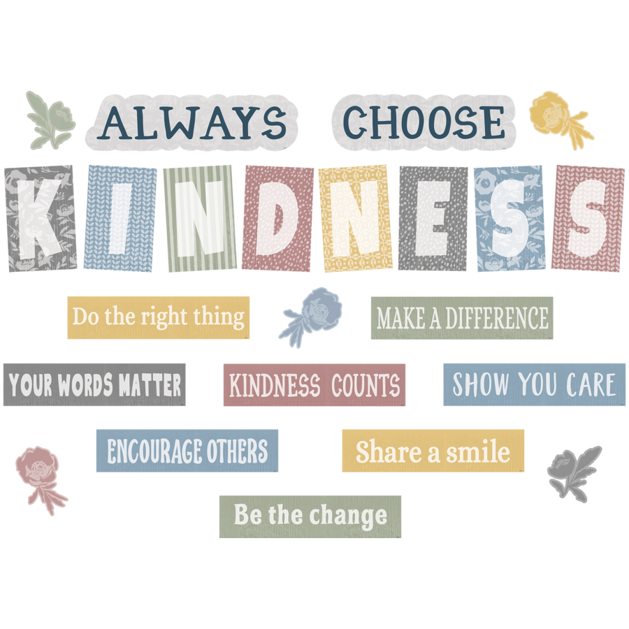 Create a kindness corner with thoughtful reminders that inspire positivity and promote a sense of connection and goodwill within your space. Bulletin board includes a guide with set-up and activity suggestions and contains a shiny protective coating for durability. Set includes 23 pieces – 10 title pieces spelling out “Always Choose Kindness”, 8 decorative signs with positive sayings, 5 flower accents. Each KINDNESS letter measures approximately 7¾" x 11".