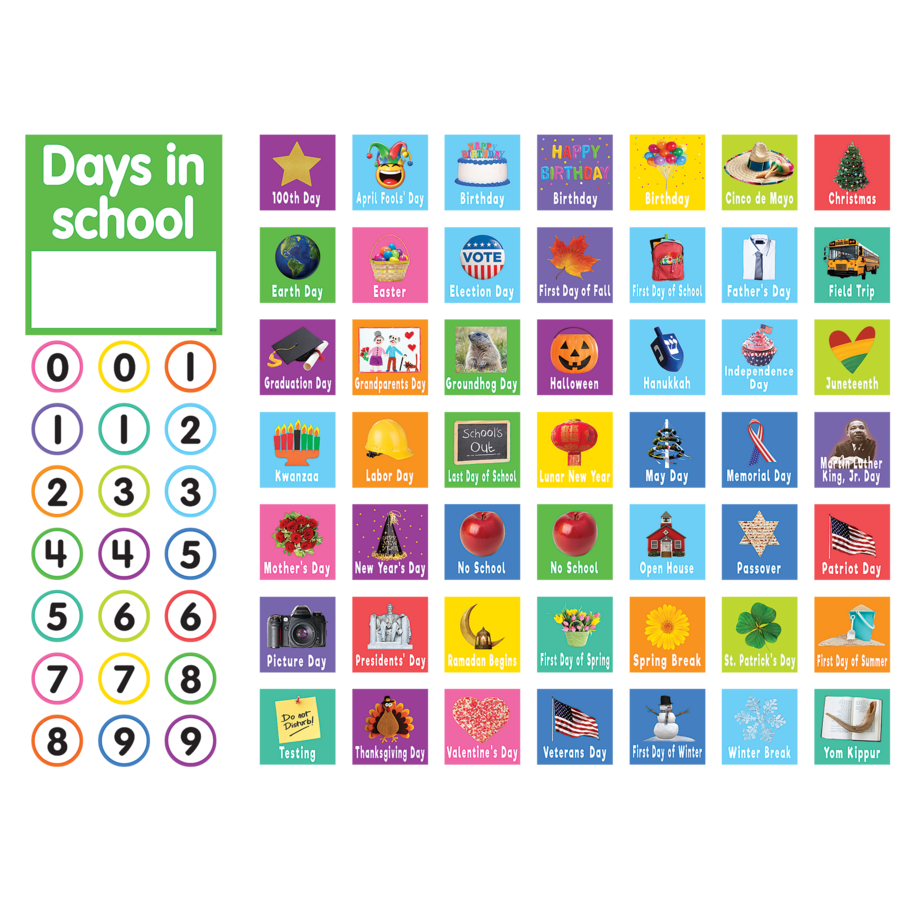 - 49 special events/holiday labels (Halloween; Veteran’s Day; Thanksgiving Day; Christmas; Winter Break; Martin Luther King, Jr. Day; Valentine’s Day; Presidents’ Day; St. Patrick’s Day; Spring Break; Memorial Day; 100th Day; Open House; (2) No School; Field Trip; (3) Birthday; April Fools' Day; Cinco de Mayo; Earth Day; Easter; Election Day; First Day of Fall; First Day of School; Father's Day; Graduation Day; Grandparents Day; Groundhog Day; Kwanzaa; Last Day of School; Lunar New Year; May Day; Mother's Day; New Year's Day; Passover; Patriot Day; Picture Day; Ramadan Begins; First Day of Spring; First Day of Summer; Testing; First Day of Winter; Yom Kippur; Juneteenth; Independence Day; Labor Day)