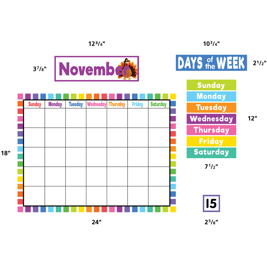 This bright and colorful calendar display comes with easy-to-read number pieces, colorful monthly headers, and additional pieces for holidays and special occasions. It also includes pieces for counting days of the school year, the weather, seasons, days of the week as well as for yesterday, today, and tomorrow. Blank calendar measures 24" x 18".