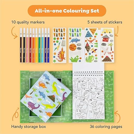 - Contains a 48-page coloring book, 10 high quality markers, 5 sticker sheets and two special storage drawers to stash your stuff.