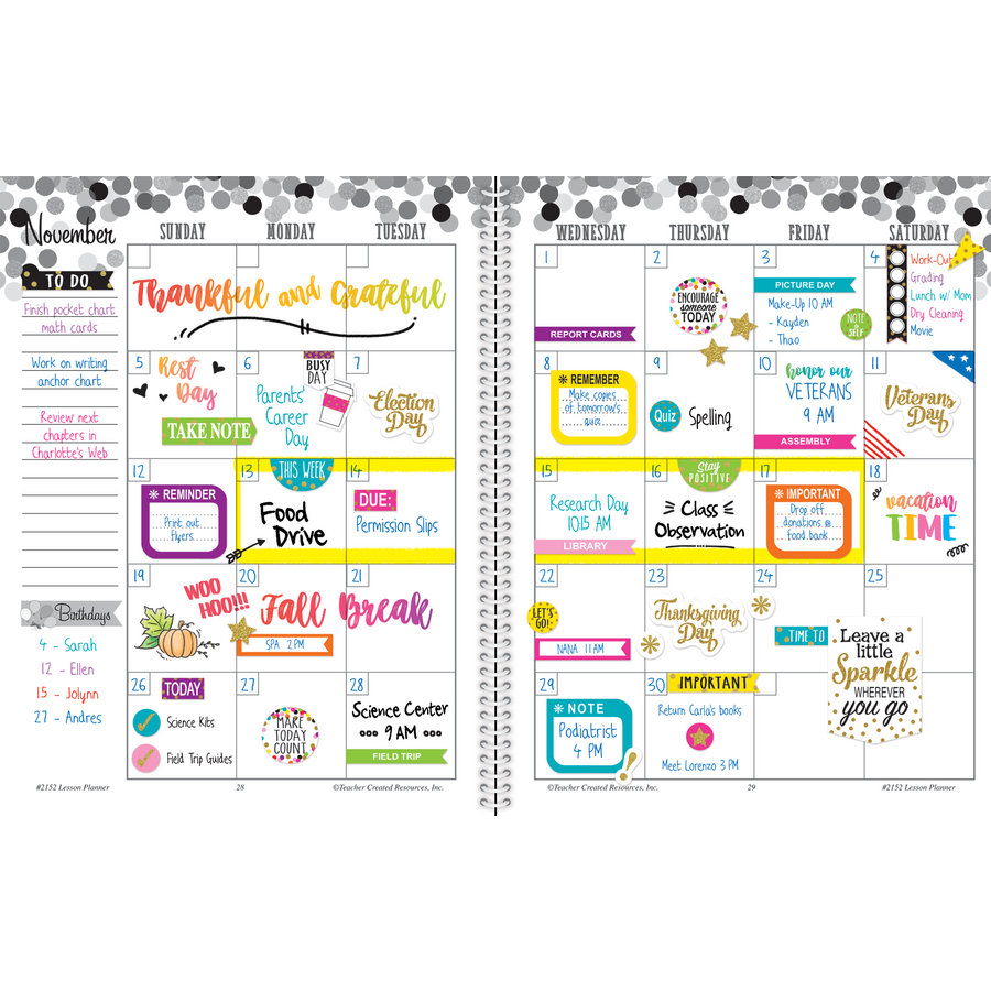 Keep up to 40 weeks of daily lesson plans in one convenient book! This book includes substitute teacher information, student roster sheets, and memorable quotations to use and discuss throughout the year. 12 large monthly planning calendar spreads are also included for year-long lesson planning as well as for scheduling appointments, conferences, and events. The lesson planner also includes a variety of colorful stickers to use throughout the year. Whether you need to prioritize the day's events, add weekly reminders, highlight something special, or simply provide a bit of inspiration these cheerful stickers will keep your lessons beautifully organized. Includes 112 pages plus 340 planner stickers. Measures 8-1/2 x 11". Spiral-bound.