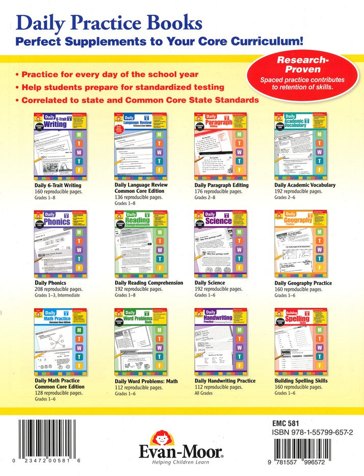 Keep language skills sharp with focused practice! With Evan-Moor's Daily Language Review, students practice language skills covering punctuation, verb tense, conjunctions, word meaning, and more in ten- to fifteen-minute daily lessons; five questions are provided for every day of a 36-week school year.