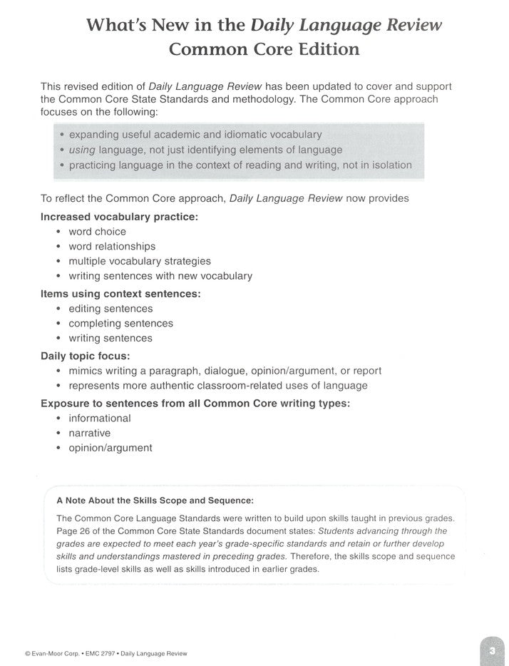 Keep language skills sharp with focused practice! With Evan-Moor's Daily Language Review, students practice language skills covering punctuation, verb tense, conjunctions, word meaning, and more in ten- to fifteen-minute daily lessons; five questions are provided for every day of a 36-week school year.