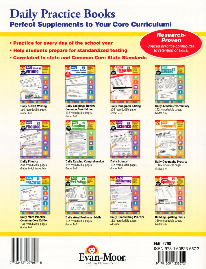 Keep language skills sharp with focused practice! With Evan-Moor's Daily Language Review, students practice language skills covering punctuation, verb tense, conjunctions, word meaning, and more in ten- to fifteen-minute daily lessons; five questions are provided for every day of a 36-week school year.
