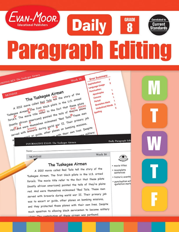 Students apply grade 8 language skills to correct a paragraph on Monday through Thursday; when read together, the four paragraphs form a cohesive composition. A writing prompt on Friday relates to the week’s four-paragraph composition and provides an opportunity for students to apply the targeted language conventions they practiced.The weekly passages cover a broad range of expository and narrative writing forms, including: