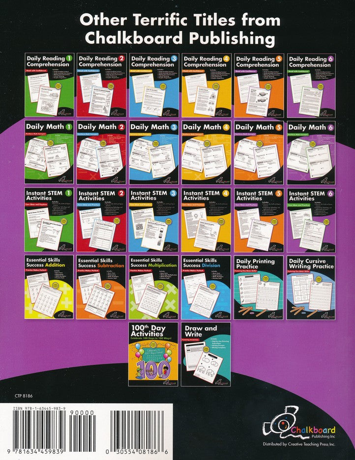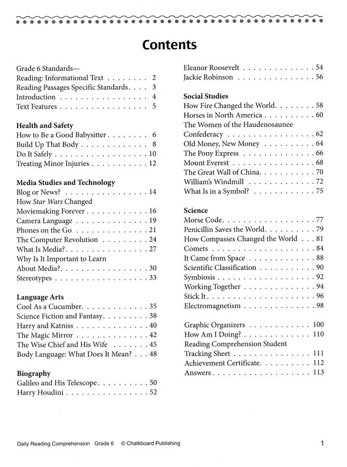 Daily Reading Comprehension workbooks will help children learn to read with confidence. This easy-to-use workbook features a passage followed by a page of comprehension questions that help students understand context, text features, make text connections, use critical thinking skills, and more. A section with graphic organizers is included in the back, along with a line-listed answer key. Grade 6. 120 classroom-reproducible pages, softcover.