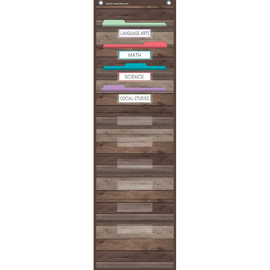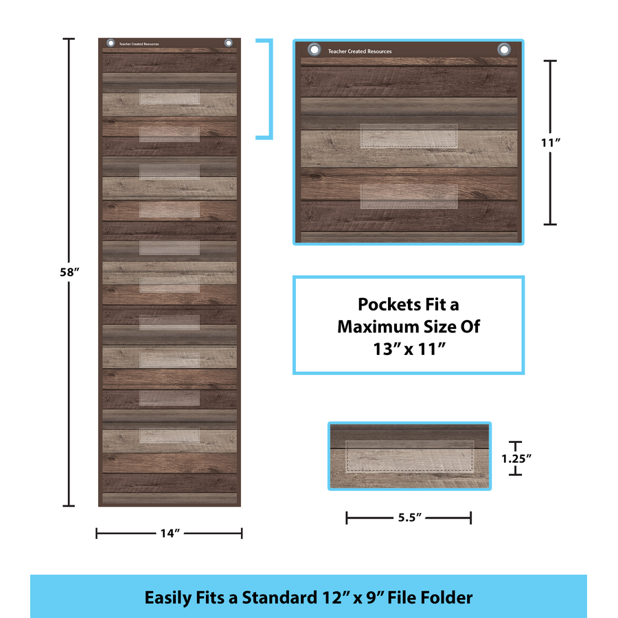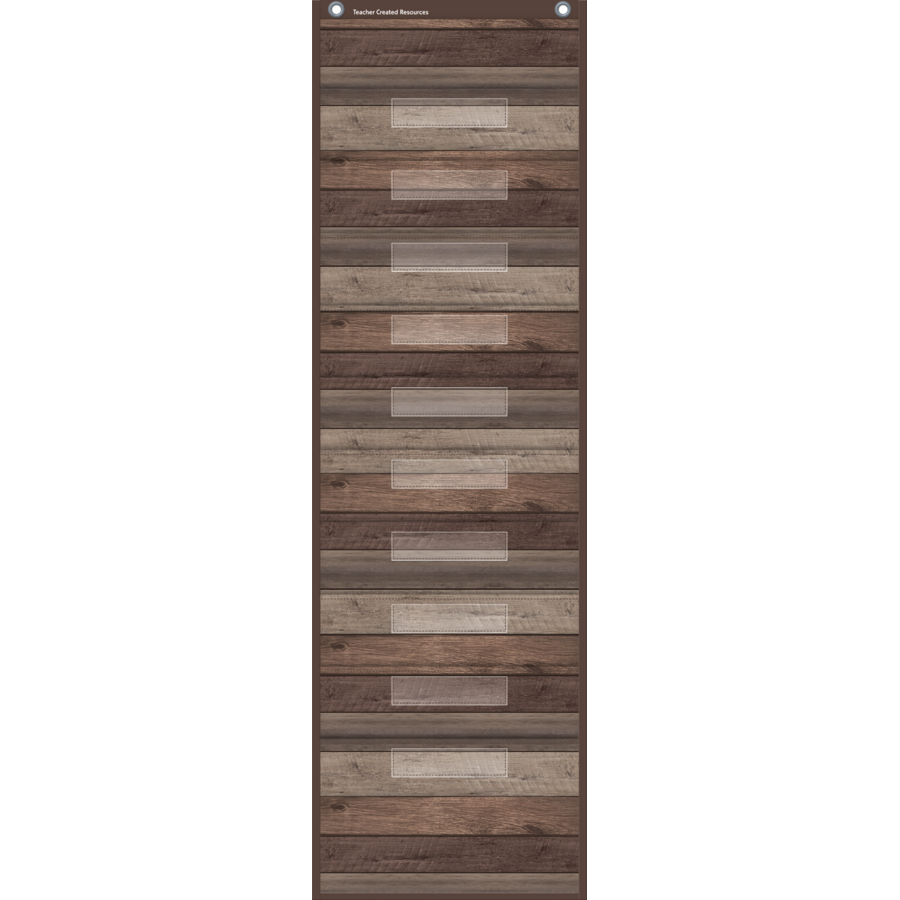 This lightweight and durable Dark Wood pocket chart features a rustic design and hangs easily from sturdy, metal grommets. 10 folder-sized pockets. Clear label holders. The non-porous surface is easy to clean and can be wiped-down or sprayed with disinfectant to help prevent the spread of germs. Measures 14" x 58".