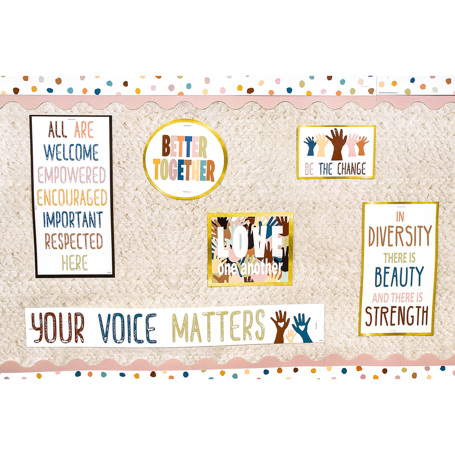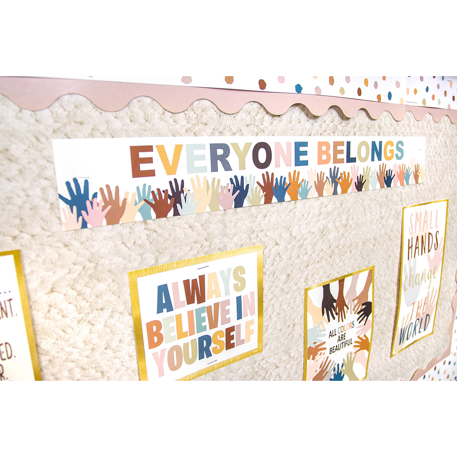 Remind your students that they matter with this uplifting and colorful bulletin board! Students will be encouraged and empowered through these positive messages and affirmations that they can truly change the world. The set includes 21 decorative signs with positive diversity messages, and a Bulletin Board Guide with suggestions and activities. Everyone Belongs piece measures 20⅛'' x 2¾''.