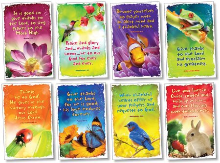 Celebrate God’s goodness by expressing your gratitude in everyday life! Eight 11×17″ posters feature the brilliant colors and intricate forms of nature, accompanied by corresponding Bilbe verses about thankfulness. 8 poster set