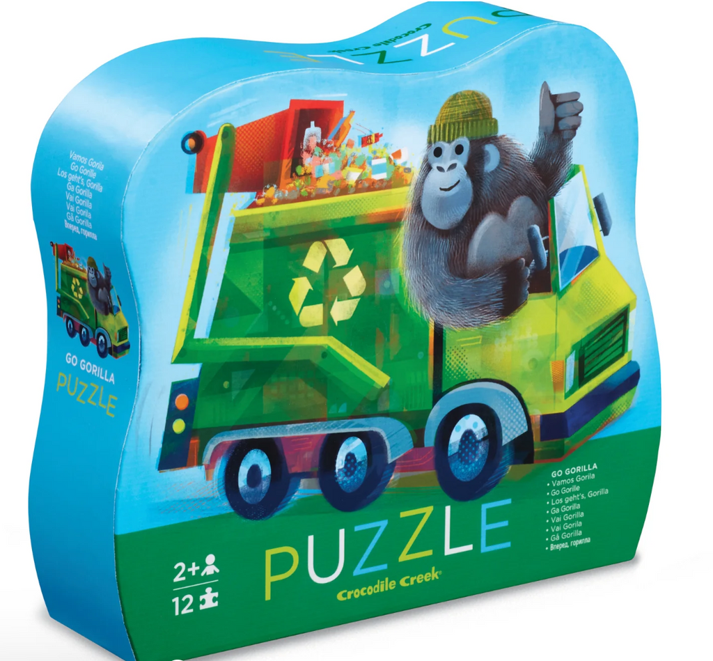 Go Gorilla! Our Recycling Gorilla puzzle will delight any little enthusiast wowed by the recycling and trash trucks roaming the local streets and neighborhoods! Featuring bold colors and a whimsically illustrated puzzle that encourages hand-eye coordination and problem-solving. Great for interaction between a parent and child that can be used over and over. A sturdy box makes for easy storage and its small size is perfect for travel.