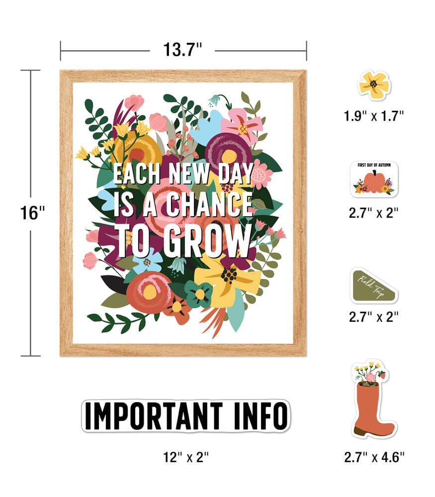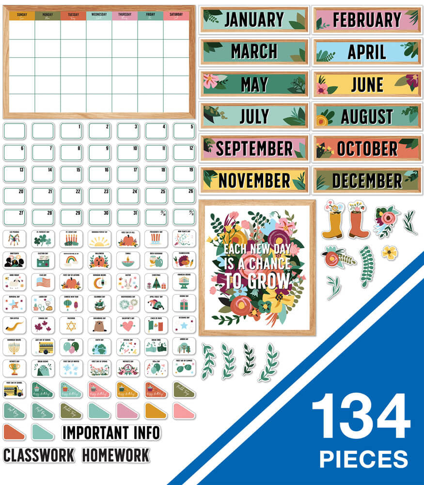 Keep your students organized and up-to-date on classroom schedules, weather, seasons, and more with Carson Dellosa's Grow Together Calendar Bulletin Board Set! The 134-piece bulletin board bundle features everything you need to reinforce schedules, important holidays, birthdays, homework, classwork, and more. The set includes a calendar with homework, classwork, important info, and 12 monthly headers, as well as number, birthday, special occasion/holiday, and blank cover-ups to customize your calendar with ease. The bulletin board decor set also includes a motivational poster and stylish leaf and flower accents to bring a touch of nature to your displays.