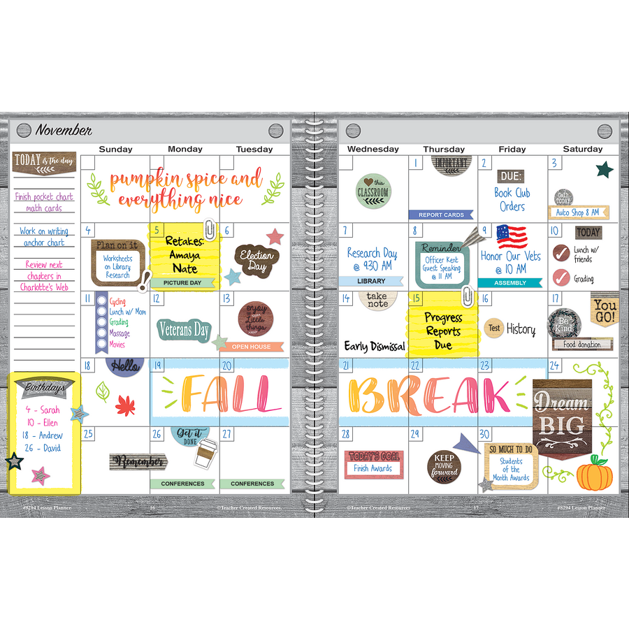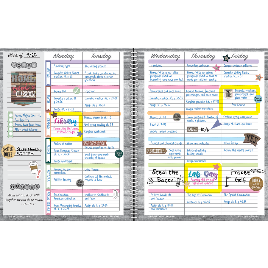 Keep up to 40 weeks of daily lesson plans in one convenient book! This book includes substitute teacher information, student roster sheets, and memorable quotations to use and discuss throughout the year. Twelve large monthly planning calendar spreads are also included for year-long lesson planning as well as for scheduling appointments, conferences, and events. The lesson planner also includes a variety of colorful stickers to use throughout the year. Whether you need to prioritize the day's events, add weekly reminders, highlight something special, or simply provide a bit of inspiration these cheerful stickers will keep your lessons beautifully organized.