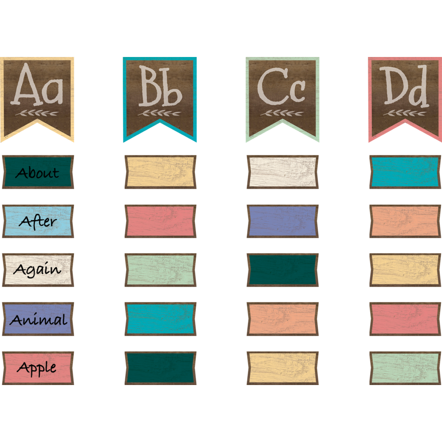 Word walls provide visual clues to help build vocabulary, spelling, and comprehension skills. This farmhouse-inspired bulletin board features 26 pennants with both upper- and lower-case letters. Also includes 65 blank cards in a variety of painted wood-inspired colors that you can use to display vocabulary words for your whole class to see. The alphabet pennant pieces measure 4½" x 5¼". Each blank card measures 4½" x 2". 126 total pieces.