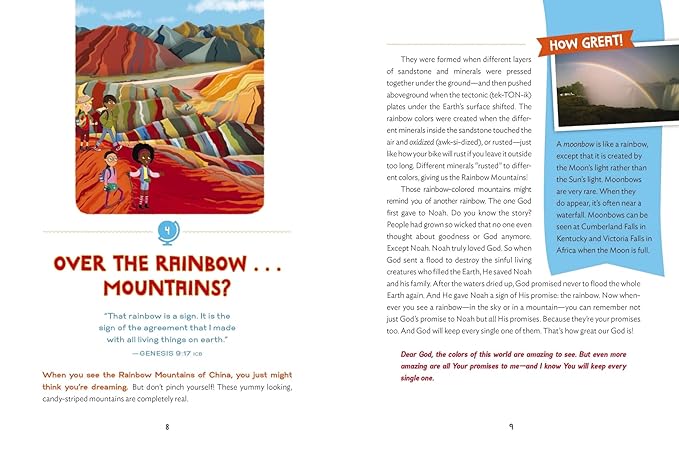 John 8:12 says, “I am the light of the world. Whoever follows me will never walk in darkness, but will have the light of life.” This mind-bending, not-so-typical devotional will deepen your kids’ awe and appreciation for God's wild imagination and infinitely creative creation, from the pink lake in Senegal to the Earth's trip around the sun to the water-holding frog that can live up to five years without a drink (what?!).