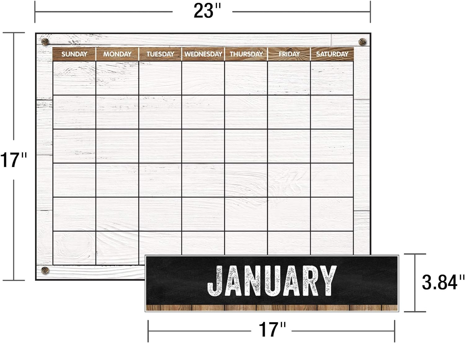 This calendar bulletin board set makes it easy to keep up with the seasons, schedule, and weather with a modern shiplap, chalkboard, and natural wood design!