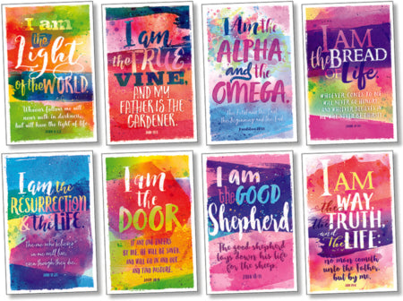 (John 20:31), “…that you may believe that Jesus is the Messiah, the Son of God, and that by believing you may have life in his name.” Set features creative typography with unique watercolor backgrounds. Eight 11″ x 17″ (27.9 x 43.2 cm) posters. 8 pieces.