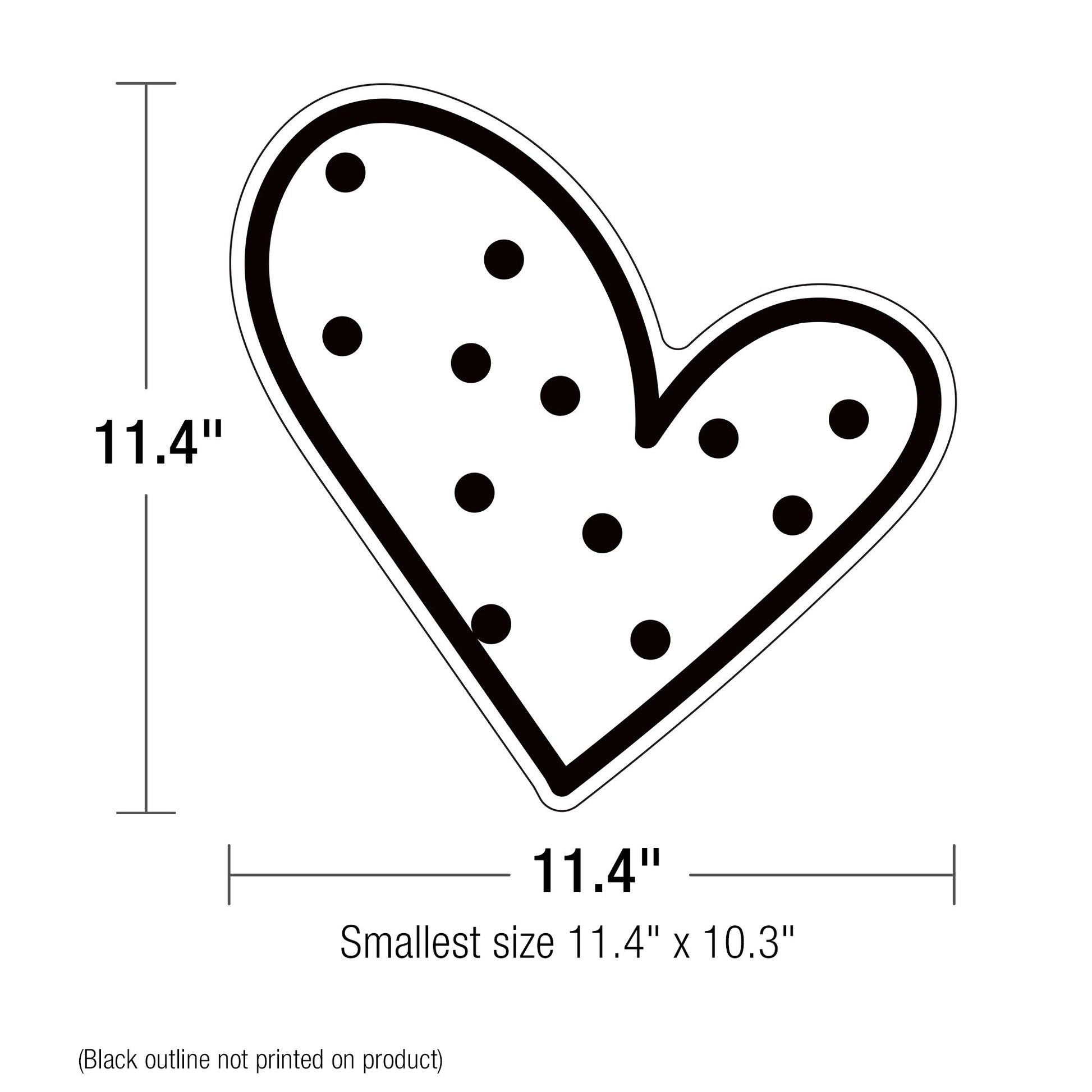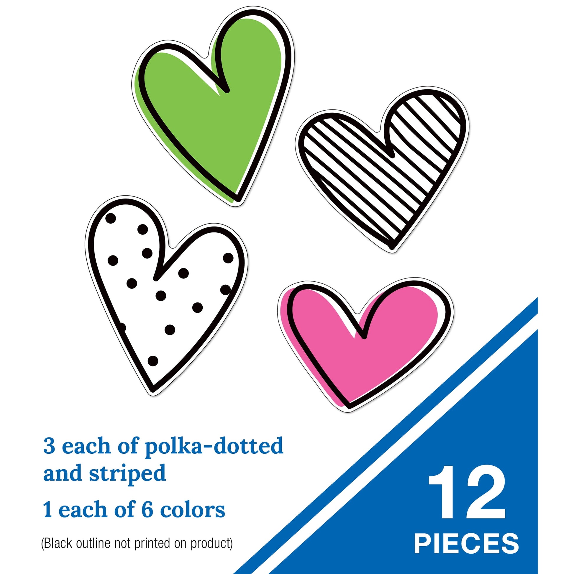 Decorate any area of your classroom with the 12-piece Kind Vibes Jumbo Doodle Hearts Cut-Outs(R). Featuring extra large doodle hearts in cheerful shades of color or black-and-white stripes or polka dots these cut-outs are sure to add a touch of fun to any space. This pack includes these assorted designs ranging in size from the largest 11.41 x 11.4 to the smallest 11.42 x 10.34 : – 3 each: polka-dotted striped – 1 each: blue green orange pink purple yellow Printed on durable card stock these versatile ready-to-use cut-outs are die-cut and reusable if laminated. A time-saving solution for adding fun and function to your learning environment add some style to displays and doors dress-up your classroom create awards decorate for parties and more. Available in a variety of shapes colors and styles colorful cut-out accents add the perfect finishing touch to centers lockers and so much more. Make sure to check out coordinating Kind Vibes products to create a cohesive classroom theme.