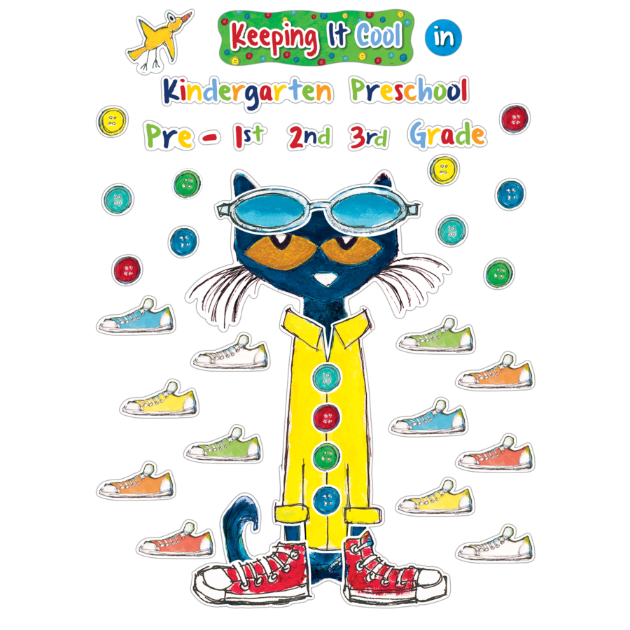 This giant Pete the Cat adjustable bulletin board comes with his own accessories and is over three feet tall! You can add Pete’s coat, his buttons, his shoes, and his sunglasses to illustrate his mood. The bulletin board includes additional shoes and buttons to write students’ names and add them to the display. Pete measures 23" x 37½" and includes 30 shoes, 16 buttons, 1 bird, and the “Keeping it Cool” header piece that can be used with any of the PreK-3rd Grade labels. 65 total pieces.