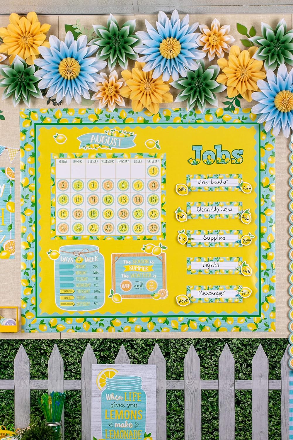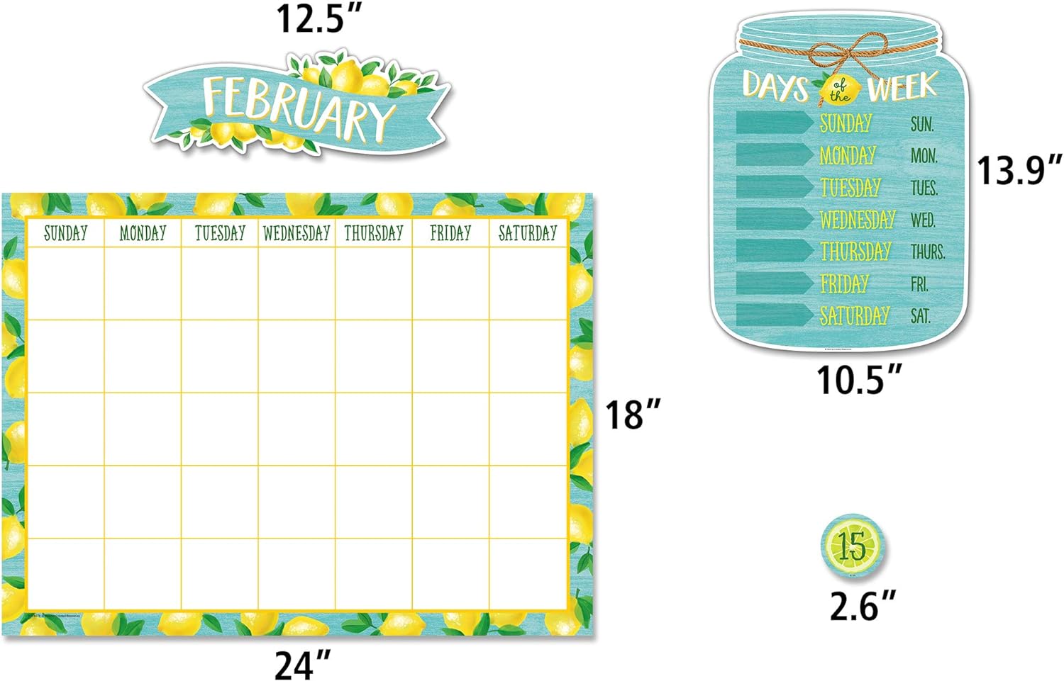 This zesty, lemon-inspired calendar display comes with easy-to-read number pieces, colorful monthly headers, and additional pieces for holidays and special occasions as well as pieces for yesterday, today, and tomorrow. Blank calendar measures 24" x 18". 97 total pieces.