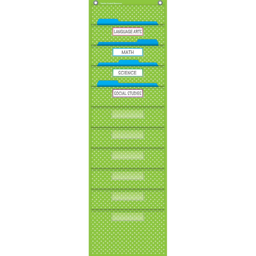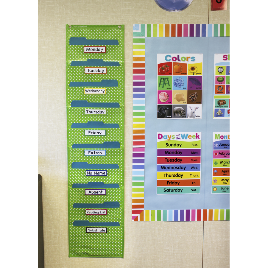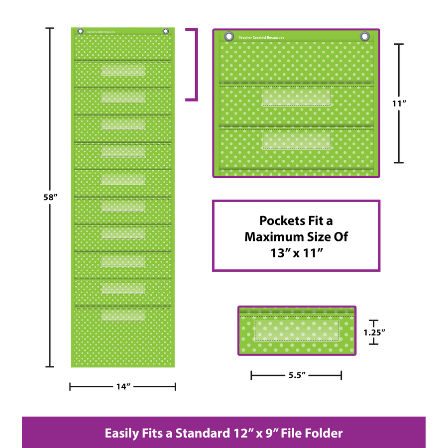 These lightweight and durable pocket charts feature colorful designs and hang easily from sturdy metal grommets. 10 folder-sized pockets. Clear Label holders. Measures 14 x 46-1/2.