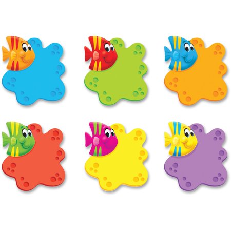 Energize spaces with a delightful fish design in 6 colors: blue red purple green orange and yellow. Use accents to praise student work; practice letters of the alphabet sight words and parts of speech; and label lockers cubbies and desks. Endless possibilities! 3 tall precut & ready to use. Durable & reusable. 6 designs 36 pieces. Coordinates with the Sea Buddies Collection.