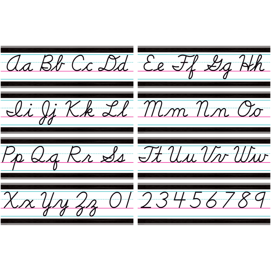Display the alphabet and numbers 0–9 as a handy reference for young students. The 4-page teacher’s guide includes writing tips. Includes 9 panels for over a 17-foot long alphabet line. Each 4-letter panel is 23½'' x 7½''.