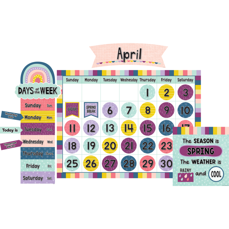 This boho-chic calendar display comes with easy-to-read number pieces, colorful monthly headers, and additional pieces for holidays and special occasions as well as pieces for yesterday, today, and tomorrow. Blank calendar measures 24'' x 18''. 96 total pieces.