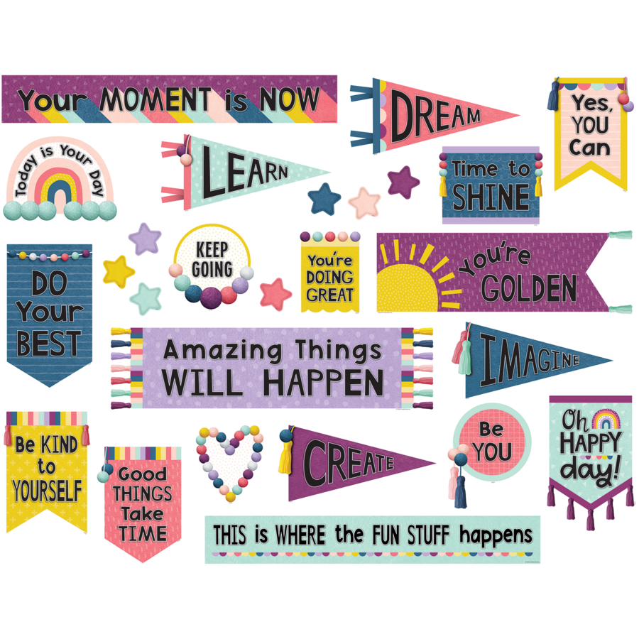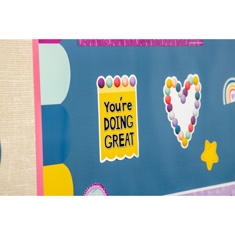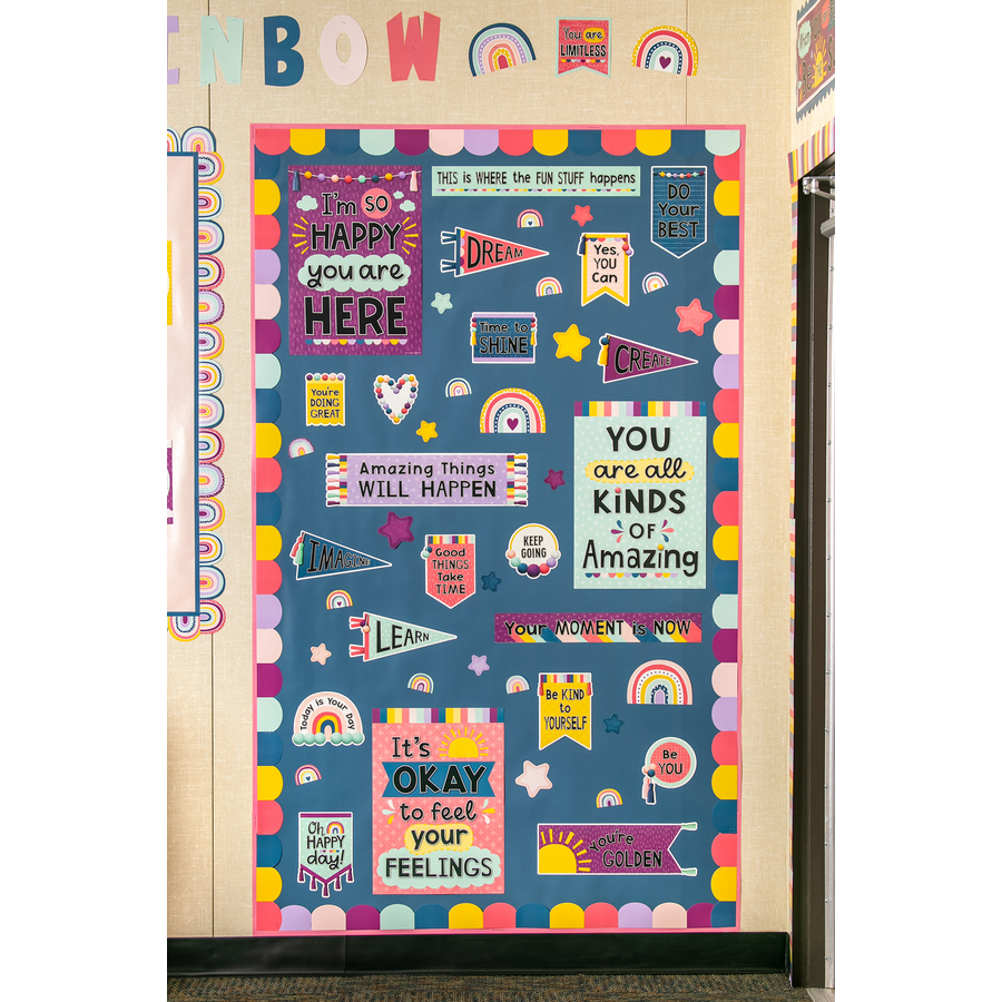 Remind your students that “Amazing Things Will Happen” with this uplifting and lively mini bulletin board. The motivational messages are displayed on signs in a variety of shapes, colors, and sizes. Includes 18 positive sayings pieces, 8 stars accents, 1 pompom heart, and a guide with suggestions and activities. Largest piece measures 20½'' x 5¾''. 27 total pieces.