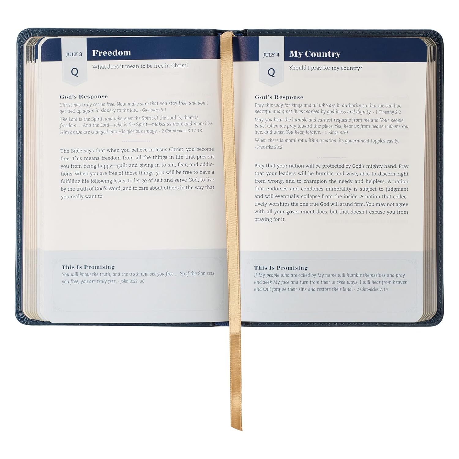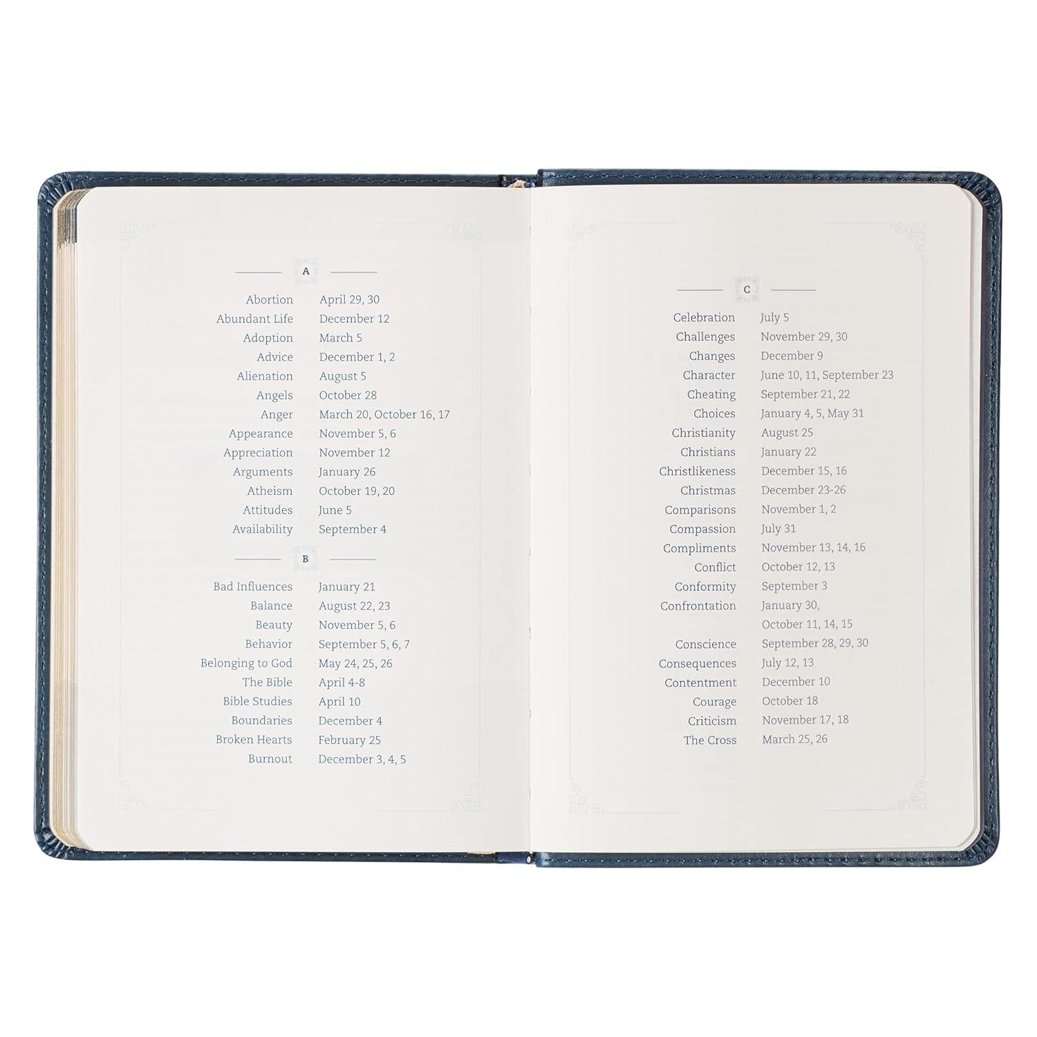 The devotional book's compact size makes it easy to slip into a backpack for devotions on the go, and a presentation page lets you personalize it. A navy satin ribbon marker is included to keep your place. The one-color pages are gilt-edged and match the gold foil accents on the cover perfectly.