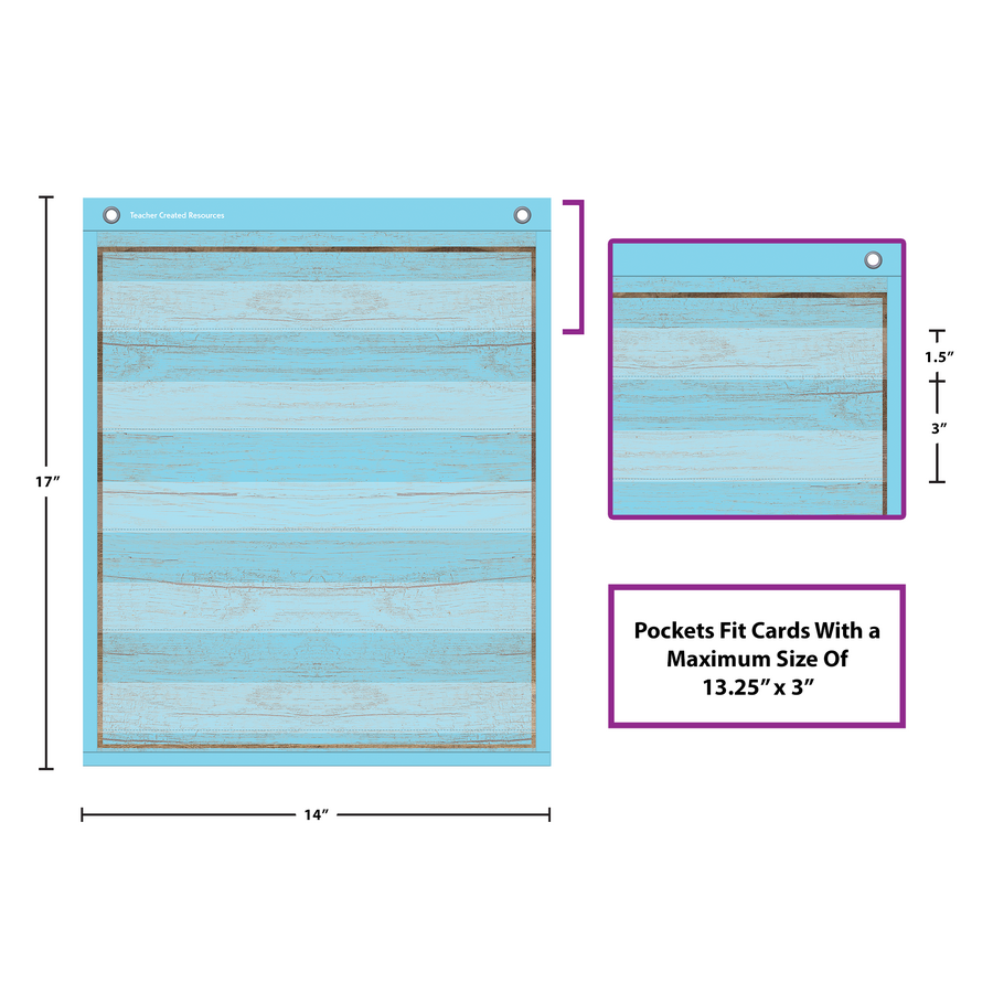 These lightweight and durable Painted Wood Magnetic Mini Pocket Charts feature rustic designs and hang easily from sturdy, metal grommets. Hidden magnets provide another hanging option! Set of 4 in multiple colors. Each pocket chart has 5 pockets. The non-porous surface is easy to clean and can be wiped-down or sprayed with disinfectant to help prevent the spread of germs. Measure 14" x 17".
