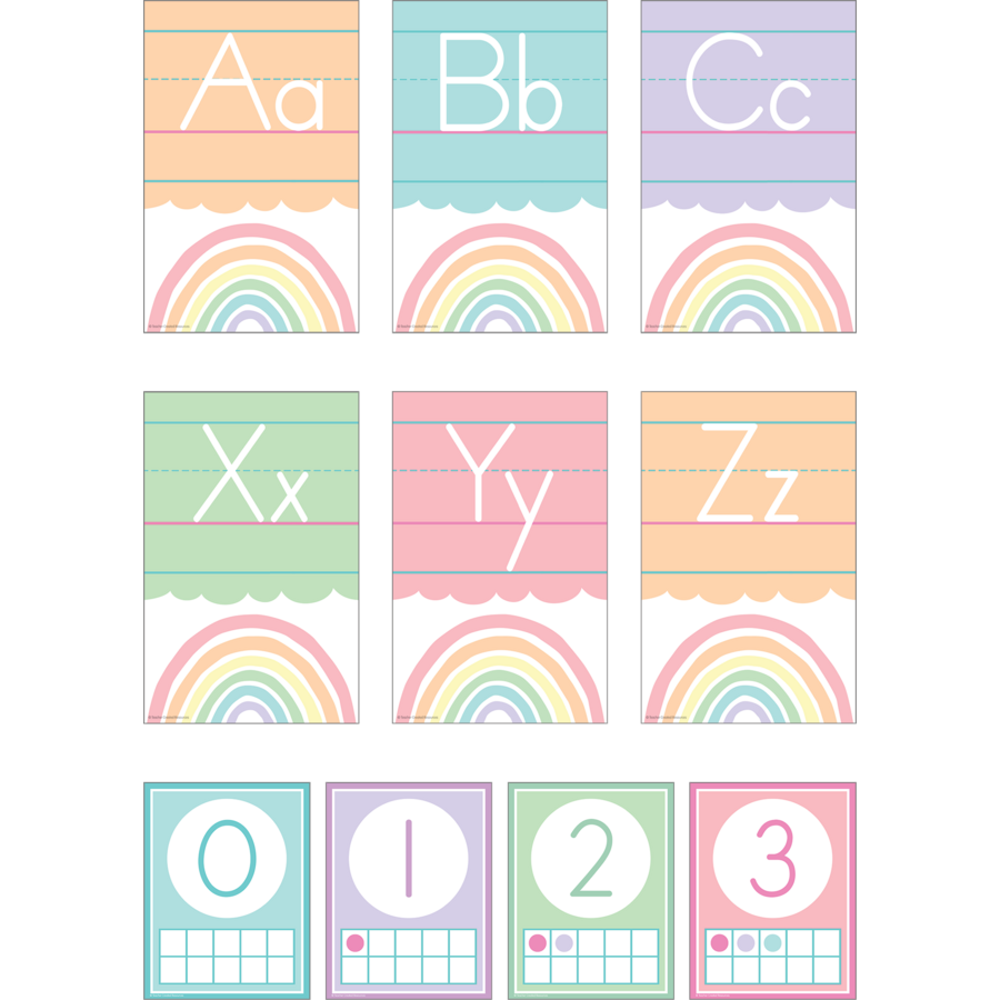 The soothing colors and charming designs of this bulletin board will make learning the alphabet fun! Alphabet cards measure 5½" x 8½" and number cards 0–10 measure 4¼" x 5½". 37 total pieces.