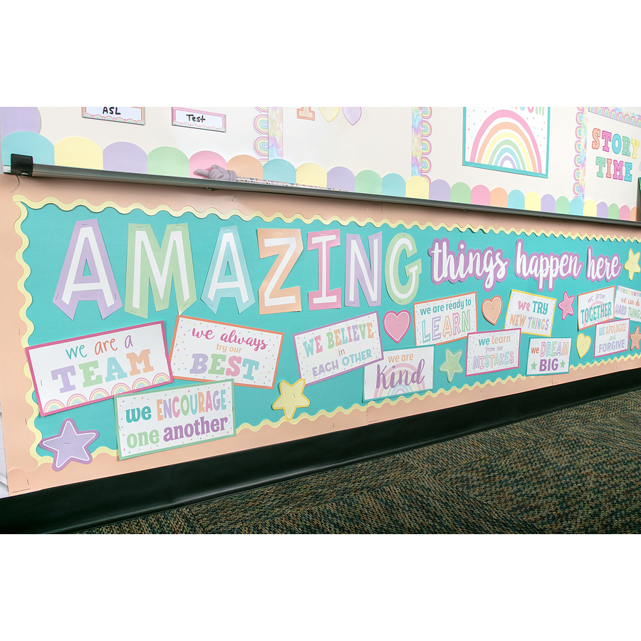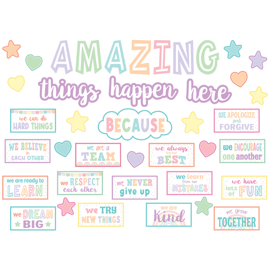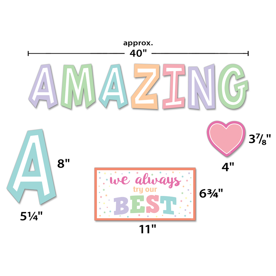 These encouraging statements guide students to create a harmonious, respectful, and supportive classroom environment! Includes 15 positive messages, 16 accents, and a teacher’s guide with suggested activities. Each AMAZING letter is about 8-1/4" tall. 42 total pieces.