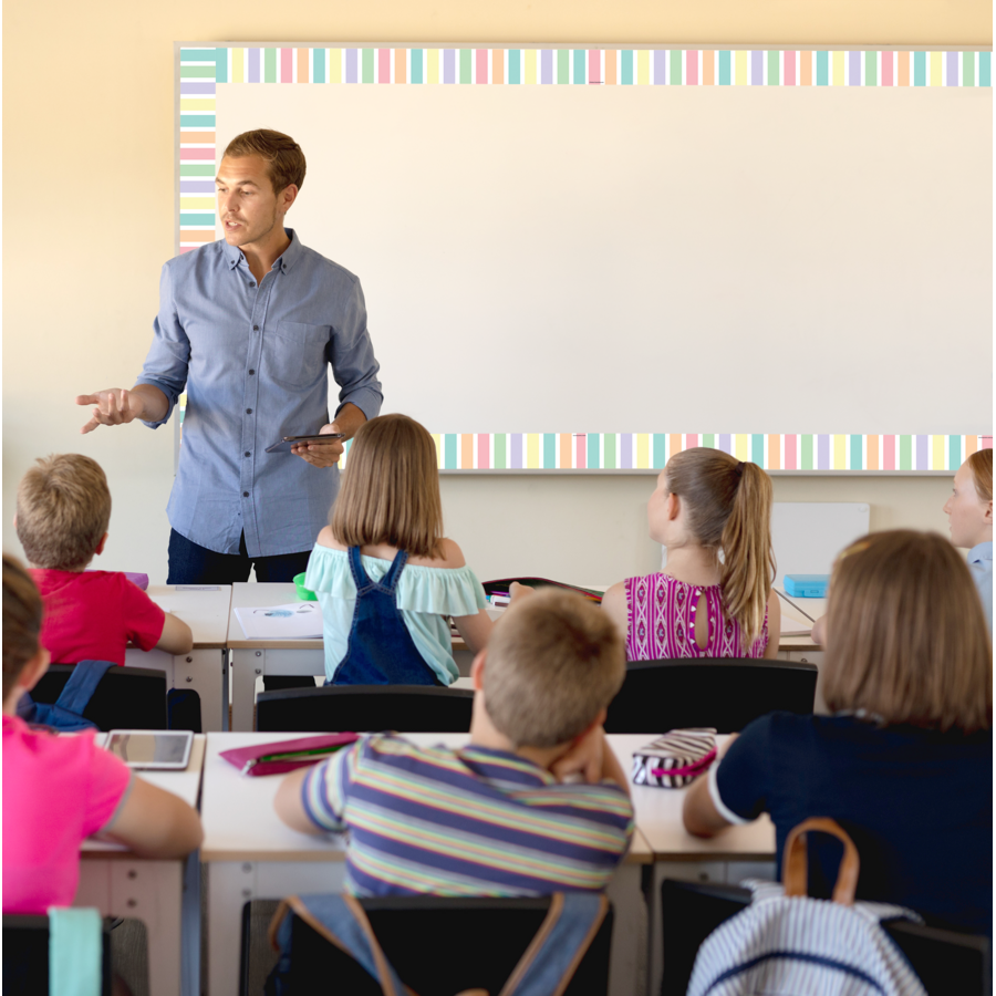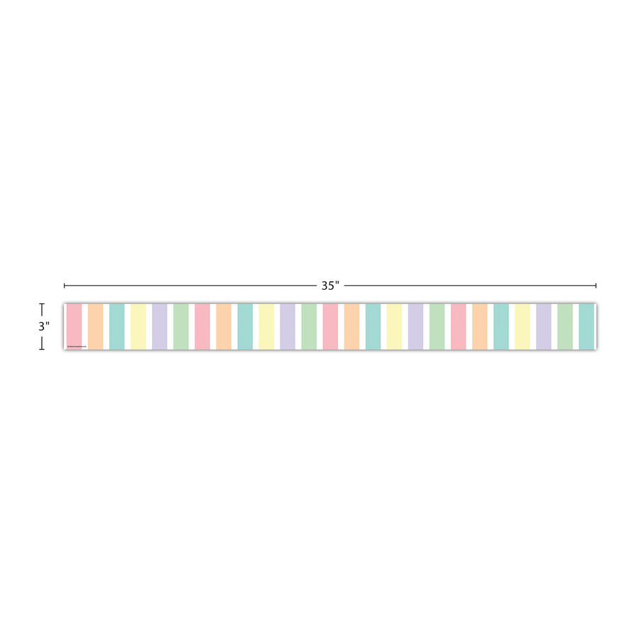 Use Pastel Pop Stripes Straight border trim to liven up your classroom! Create fresh looks for bulletin boards, windows, walls, and class projects. Mix and match with coordinating products (stickers, notepads, awards, etc.) for a classroom theme. Each pack has 12 pieces (3'' x 35'') for a total length of 35 feet of trim!