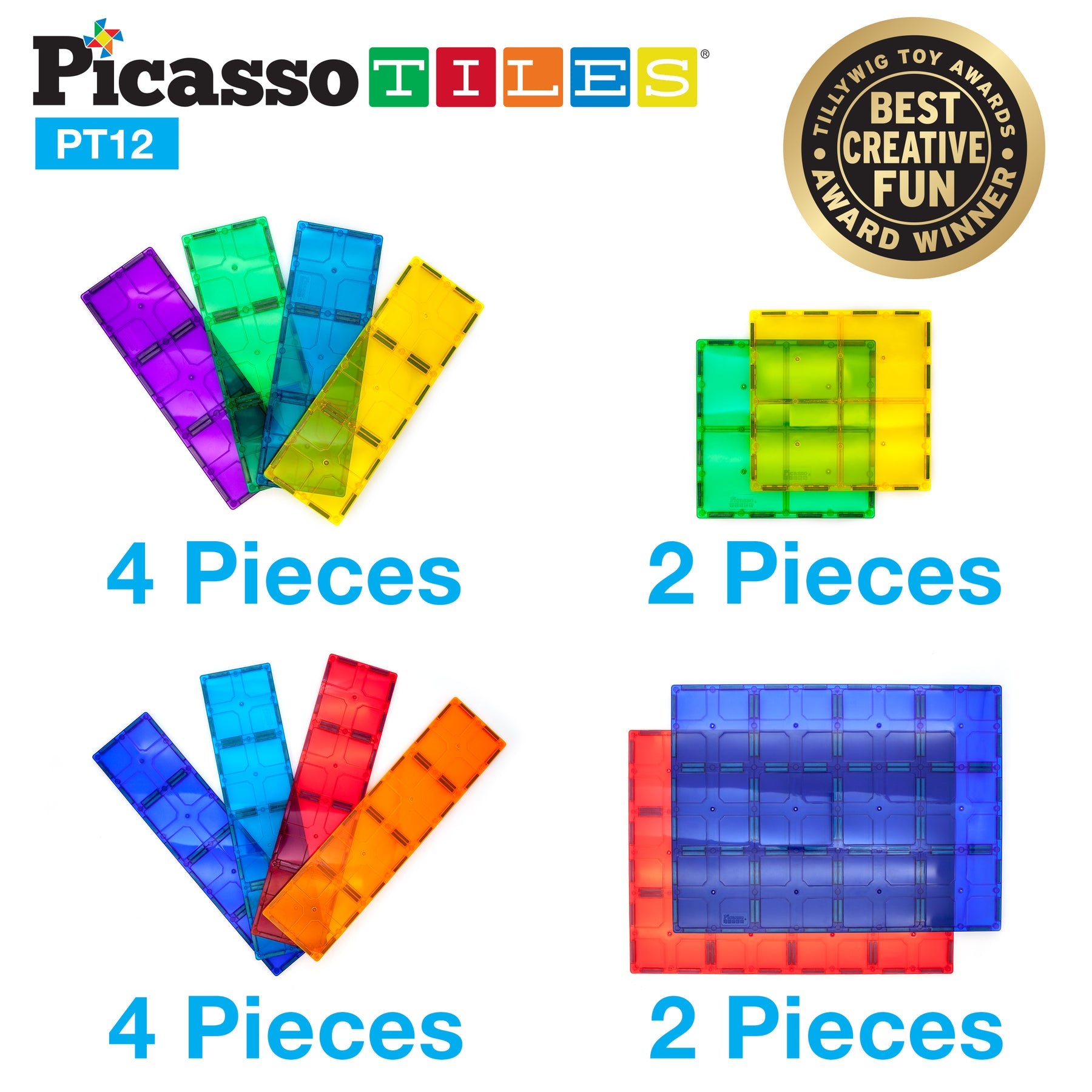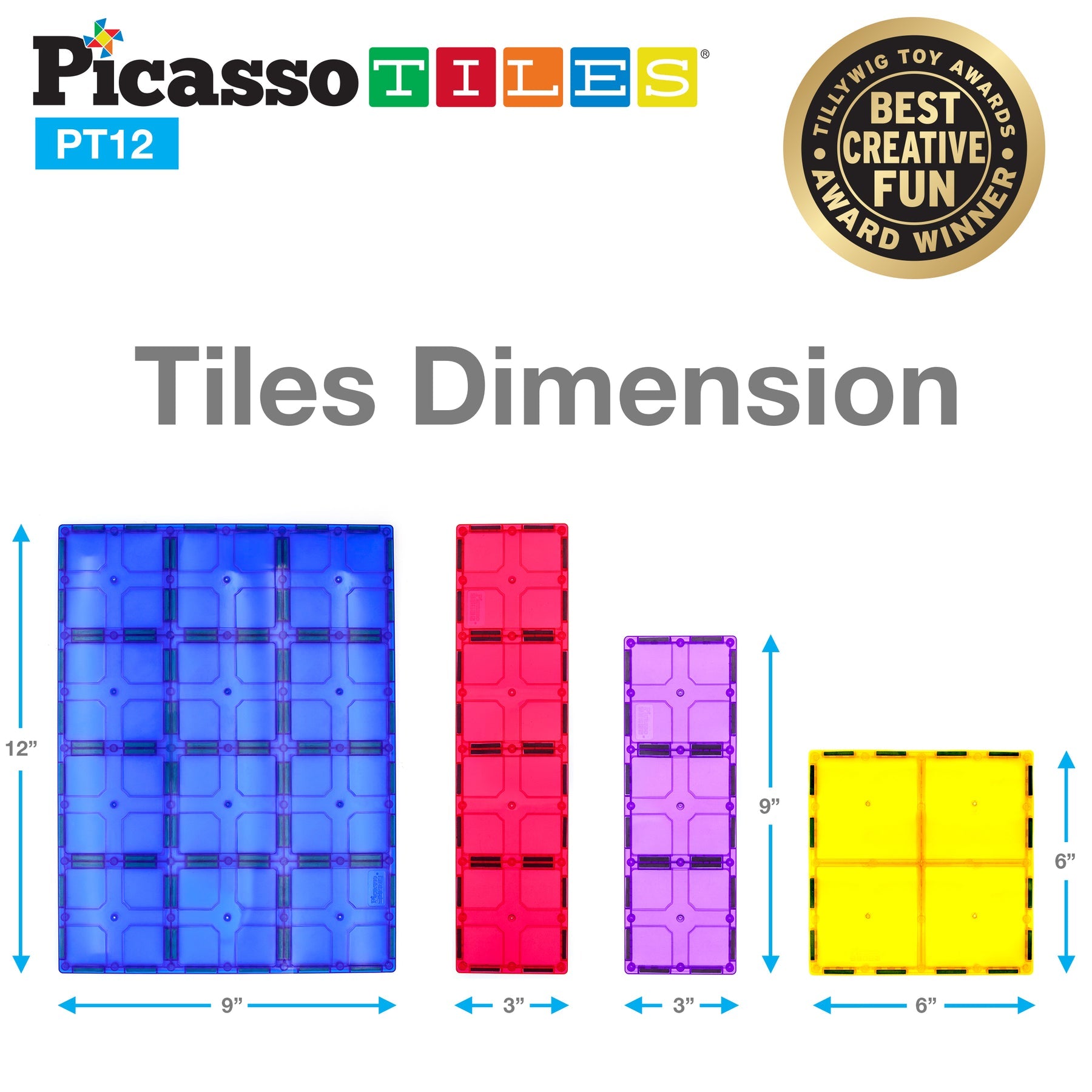 Experience the freedom of large connected magnet tile toy construction tile pieces with our 12-piece PicassoTiles magnetic tile set (SKU: PT12). No need to connect individual magnet tile toy pieces, each magnet tile piece is already constructed big and ready to inspire creativity!