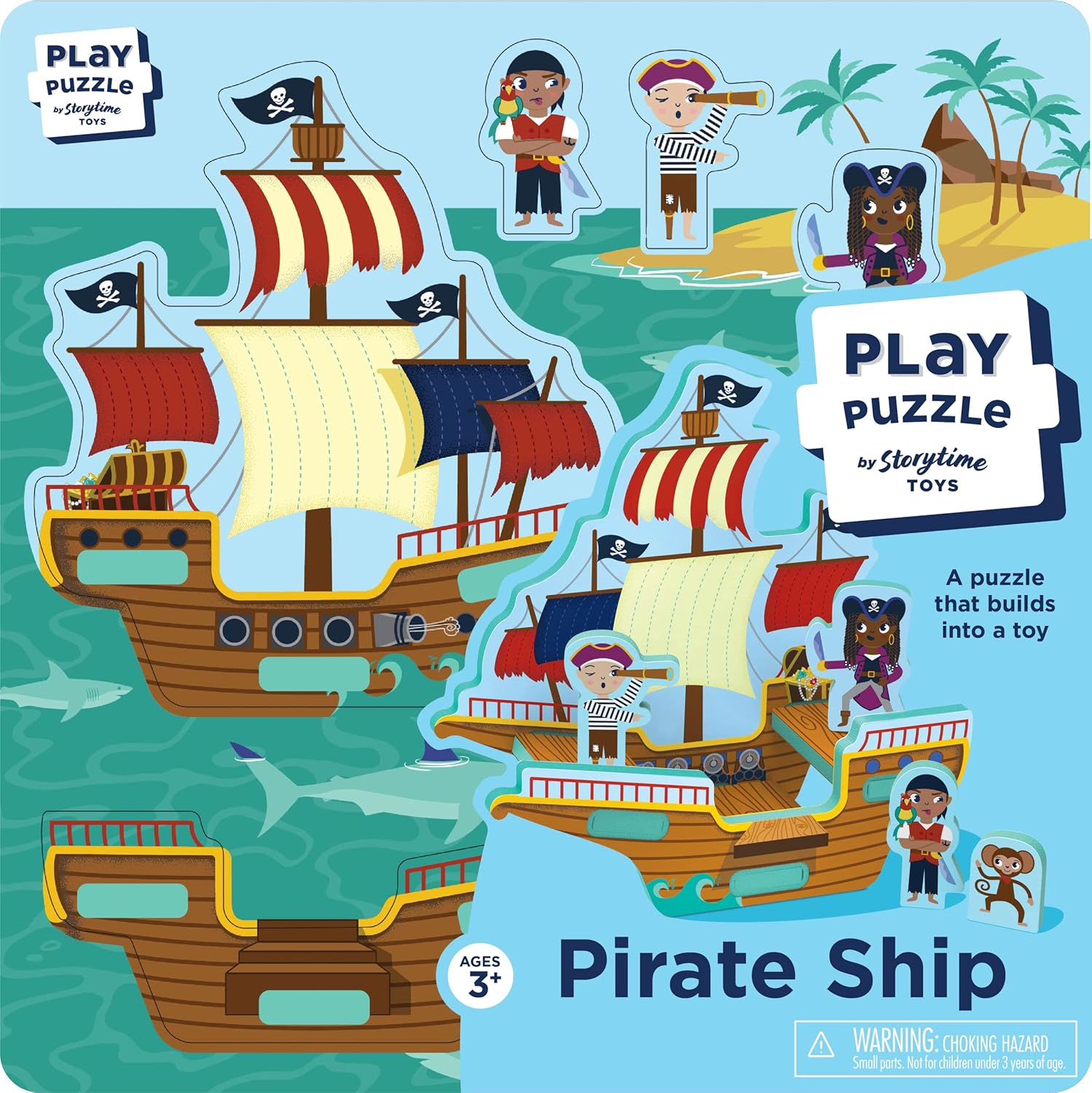 - Pirate Ship Toy Puzzle for Kids: Pop out the 9 easy grasp foam puzzle pieces from the play surface board to build a durable 3D pirate ship toy. Includes a desert island scene with a pirate ship, three pirates, and monkey characters.